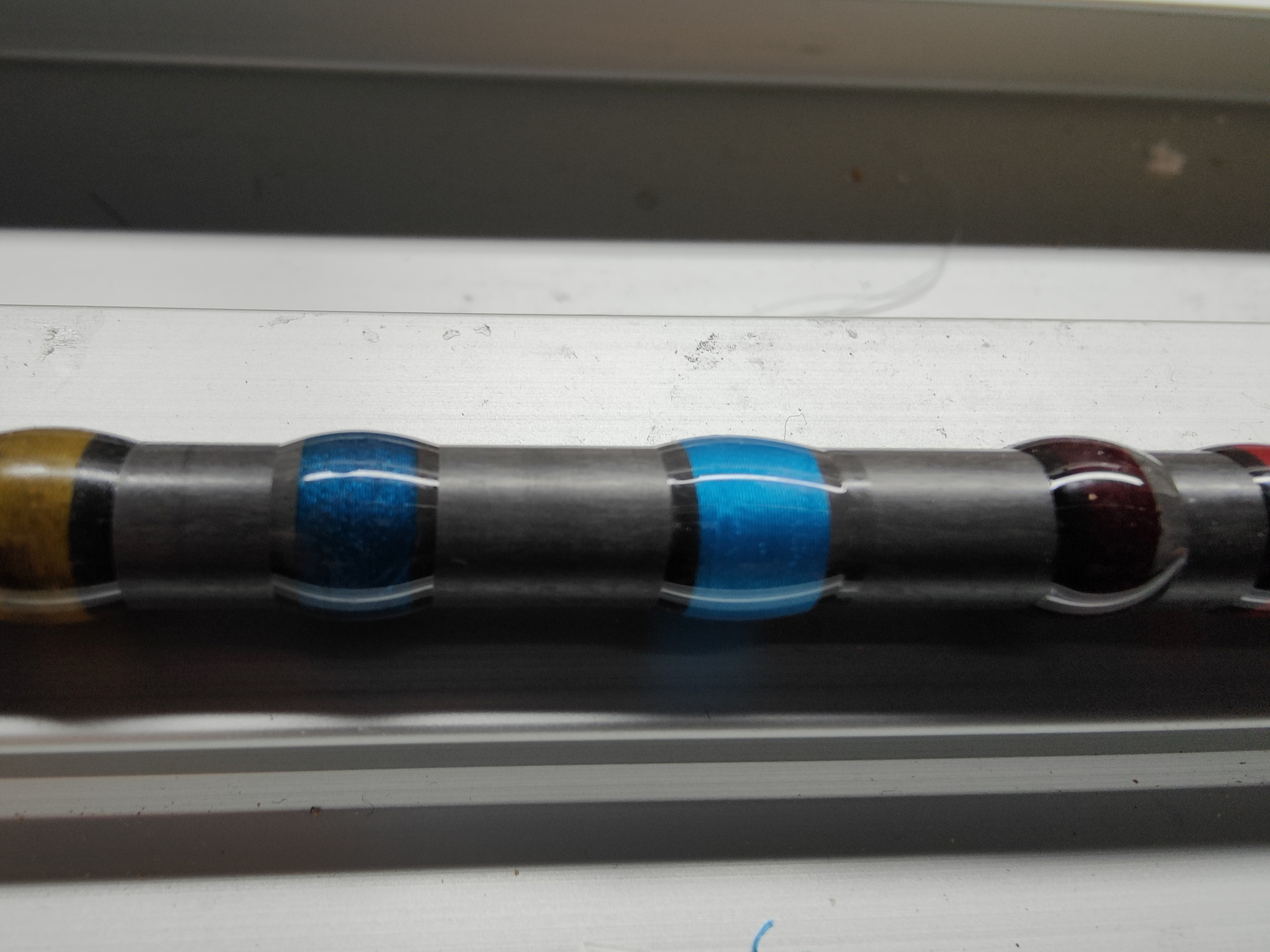 In der Tat ist der Ring etwas anderst als die vorherigen Ringe, ich hatte alle Ringe bis auf den vor dem Spitzenring schon gewickelt und lackiert weil ich dachte es wurde mir ein falscher Ring mitgeliefert. Dann dachte ich OK, ich bestell einen nach und mach die Rute schonmal bis auf den Ring fertig, aber der war dann genauso, irgendwie muss da eine Chargen Unterschied sein, hab die Biegung aber korrigiert, er sieht aber trotzdem etwas anderst aus. Der blank ist ja als Reiserute angegeben deshalb 4teilig,ich hätte ihn auch gerne einteilig gehabt,aber ich dachte mir ne Reiserute isbja auch mal gut zu besitzen.