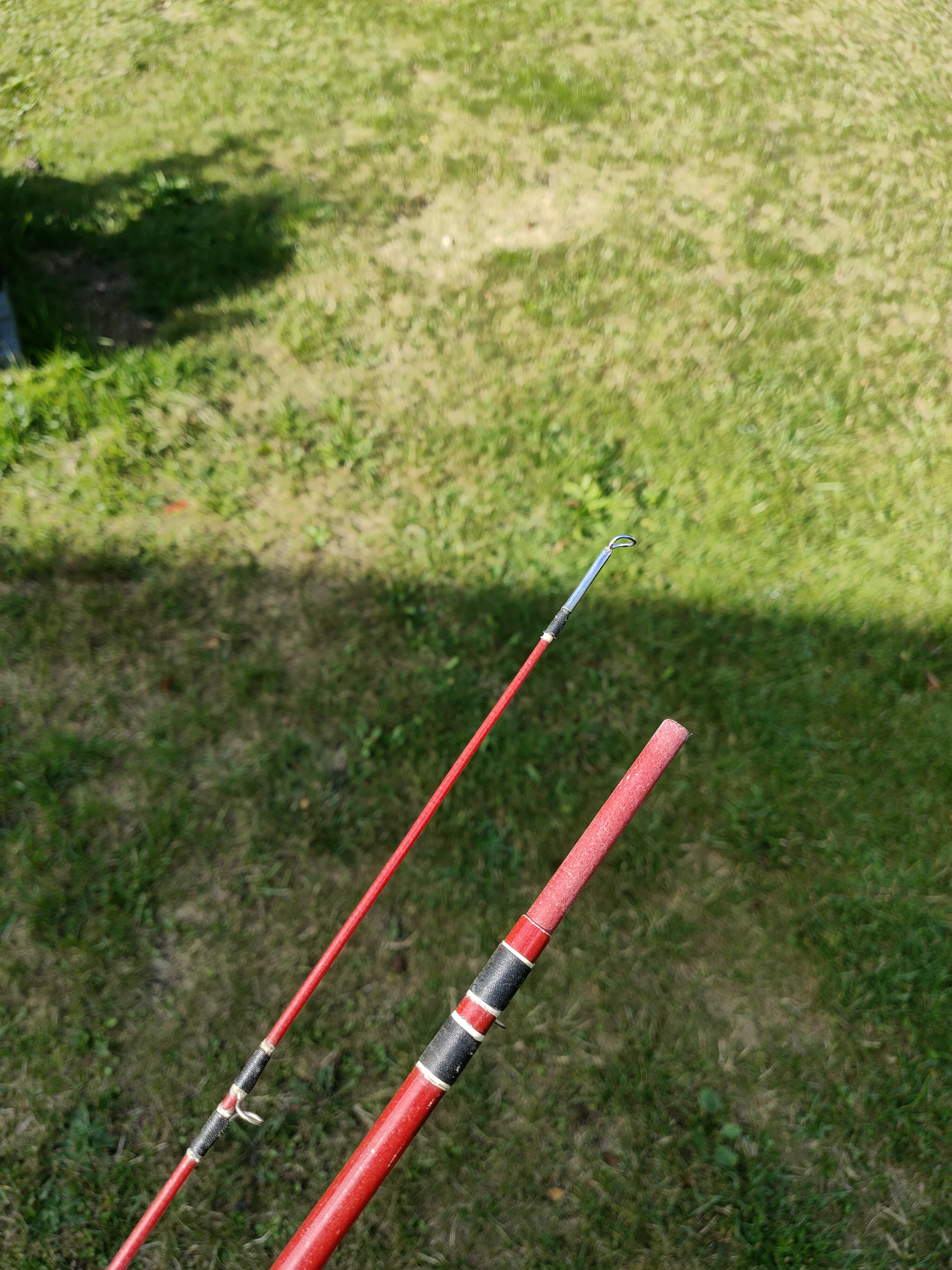Den Blank habe ich geteilt und für die Zapfen das Oberteil eine alten Pilkrute aus Glas genommen. Farblich ziemlich stimmig, wie ich finde. Roter Edding mit ein wenig PUR Leim hat die Zapfen auch noch etwas aufgehellt. Die weißen Zierränder wollte ich, wie original, ursprünglich auch mit Klebeband machen. Coroplast trägt mir aber zu dick auf und eine Alternative habe ich nicht gefunden. Evtl. geht dieses dünne weiße Klebeband, mit dem manchmal Klarsichttüten verschlossen werden. Das habe ich aber nicht in Kleingebinden gefunden und wollte es auch nicht in einem Geschäft schnorren. Also habe ich es anständig mit NOCP Bindegarn gemacht. Die Rute war mit einem Zweistegring ohne Einlage, 5 Schlangenringen und dem Spitzenring beringt. Die Schlangenringe haben eine tolle Form, waren sehr sauber angeschliffen und auch nicht schwerer als modernere Standard Schlangenringe. Leider ist die Oberfläche nicht mehr glatt und gehärtet sind sie auch nicht. Der Stripper (2,75g) und der Spitzenring (0,6g) sind dagegen ziemlich schwer.