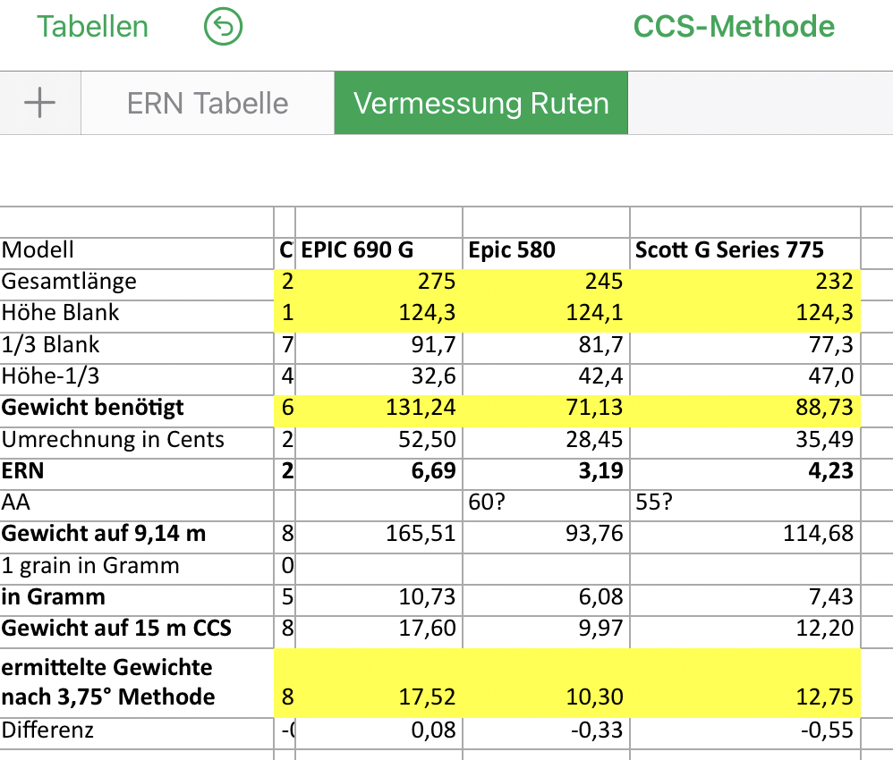 das habe ich nicht berücksichtigt, da ich die Spitze immer an der 0° Linie ausrichte. Ich habe heute auch noch einmal alle 3,75° und 15° Ergebnisse kontrolliert. Die Abweichungen waren aber max. 0,2g im 3,75° Bereich und ich musste nichts korrigieren. Ob die CCS Messungen jetzt deutlich differieren müssste ich kontrollieren. Die Glasruten haben schon einen deutlichen Durchhang.