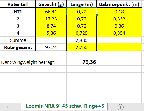 Für meine Rute habe ich 71,0 mit Balancepunkt bei 59,7cm ermittelt bei einem Gesamtgewicht von 98 g.
