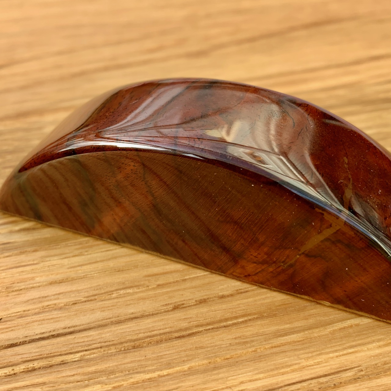 Auf der hellen karelischen Maserbirke gibt die leichte Tönung der Oberfläche einen Ton ins Honiggelbe und wenn man es rotiert changiert es zwischen weiß und gelblich - brutal!