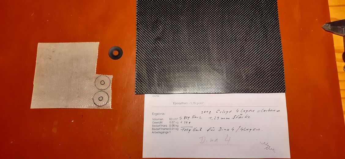 Bild 17 – Nun werden wir eine neue Bresscheibe bauen, dazu habe ich Carbon Platten und GFK Platten laminiert, mit einem guten Millimeter. Wobei ich in der Bremswirkung keinen Unterschied zwischen GFK und Carbon bemerkt habe.