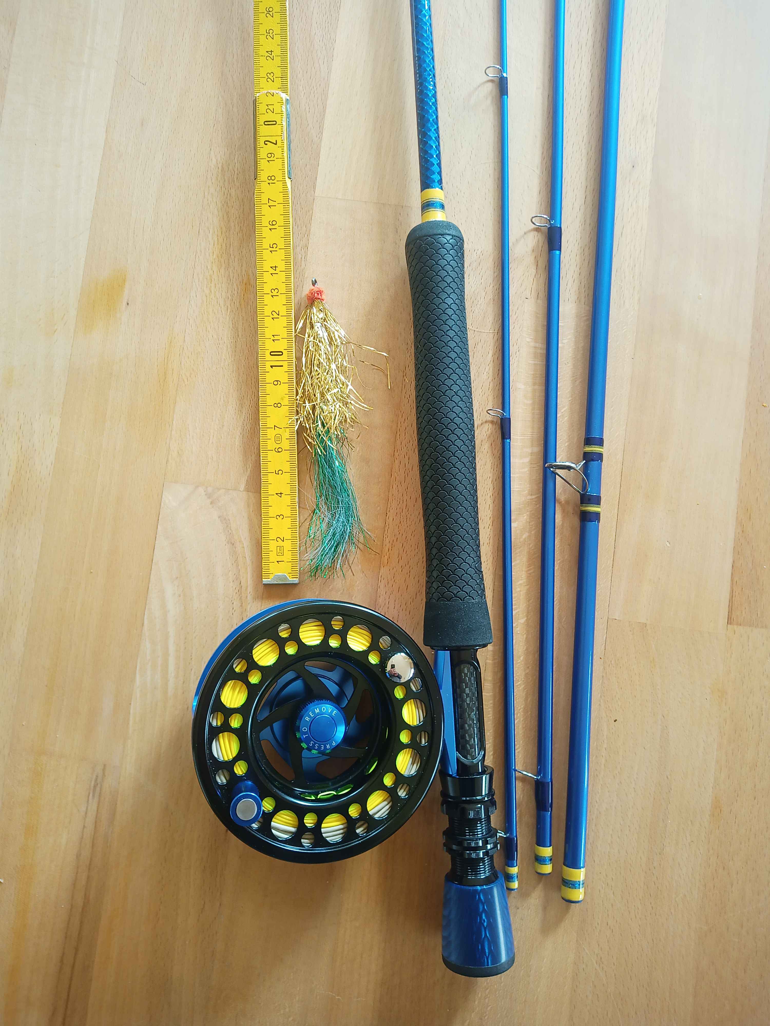 Grob Distanzen auf Wiese neben Fluss geworfen kann ich 25m mit Leerwürfen in der Luft halten (Schnurhand bis Schnurspitze) und mit dem erwähnten Streamer lag ich so bei ca. 30m Wurfweite, Vorfach war dabei gut gestreckt.