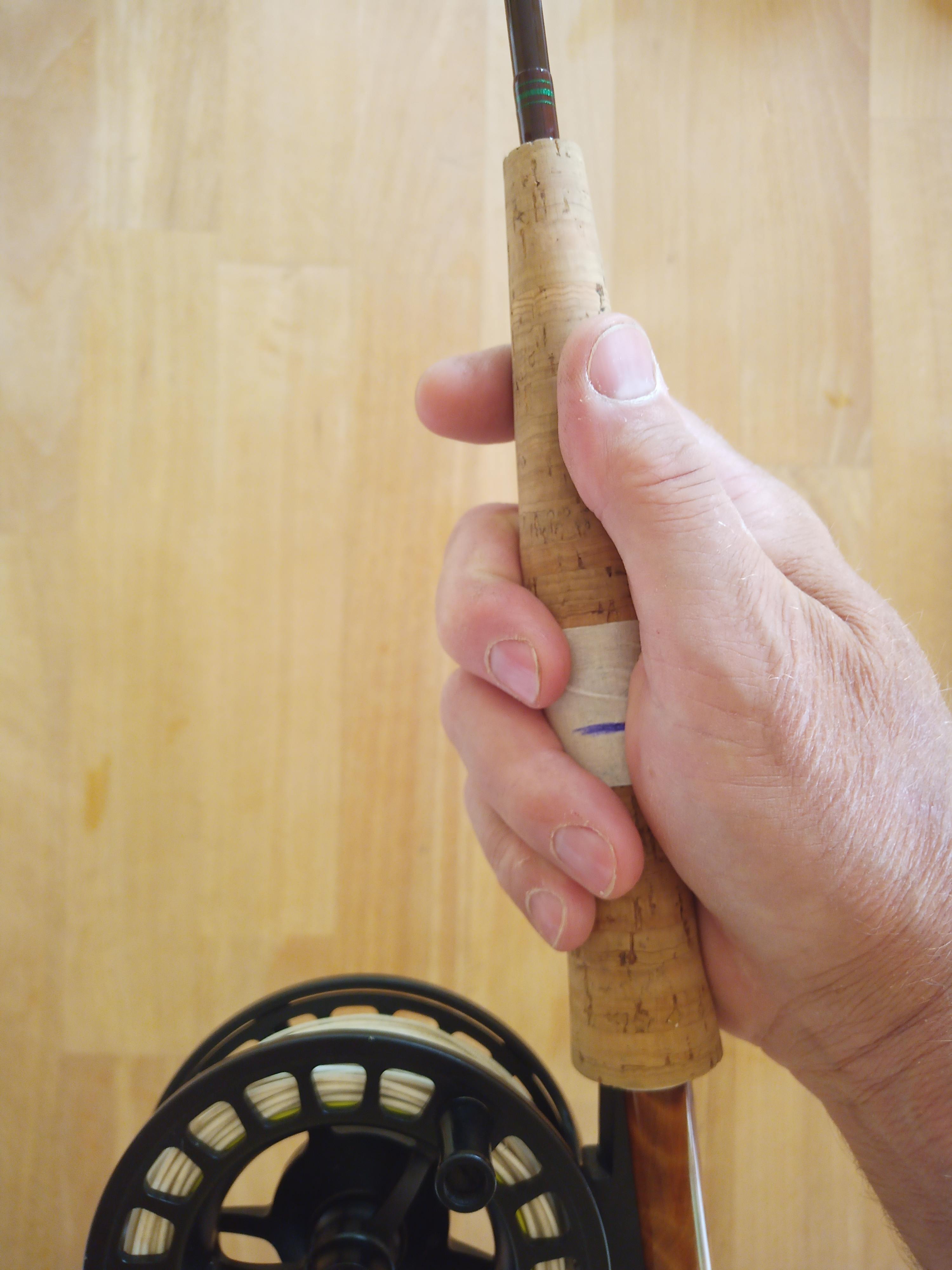 Effektiv bleiben von meinen 11cm mehr an freier Blanklänge zwar weniger übrig, aber schon dass scheint mir einen Unterschied zu machen. Ich habe mal ein Foto mit meiner Handhaltung bei der Rute mit Korkgriff gemacht. Der Strich auf dem Tape zeigt den Punkt wo der freie Blank im Swinger endet. 15cm mehr freier Blänk wären auch möglich, was den Punkt noch 4cm nach unten verlagern würde.