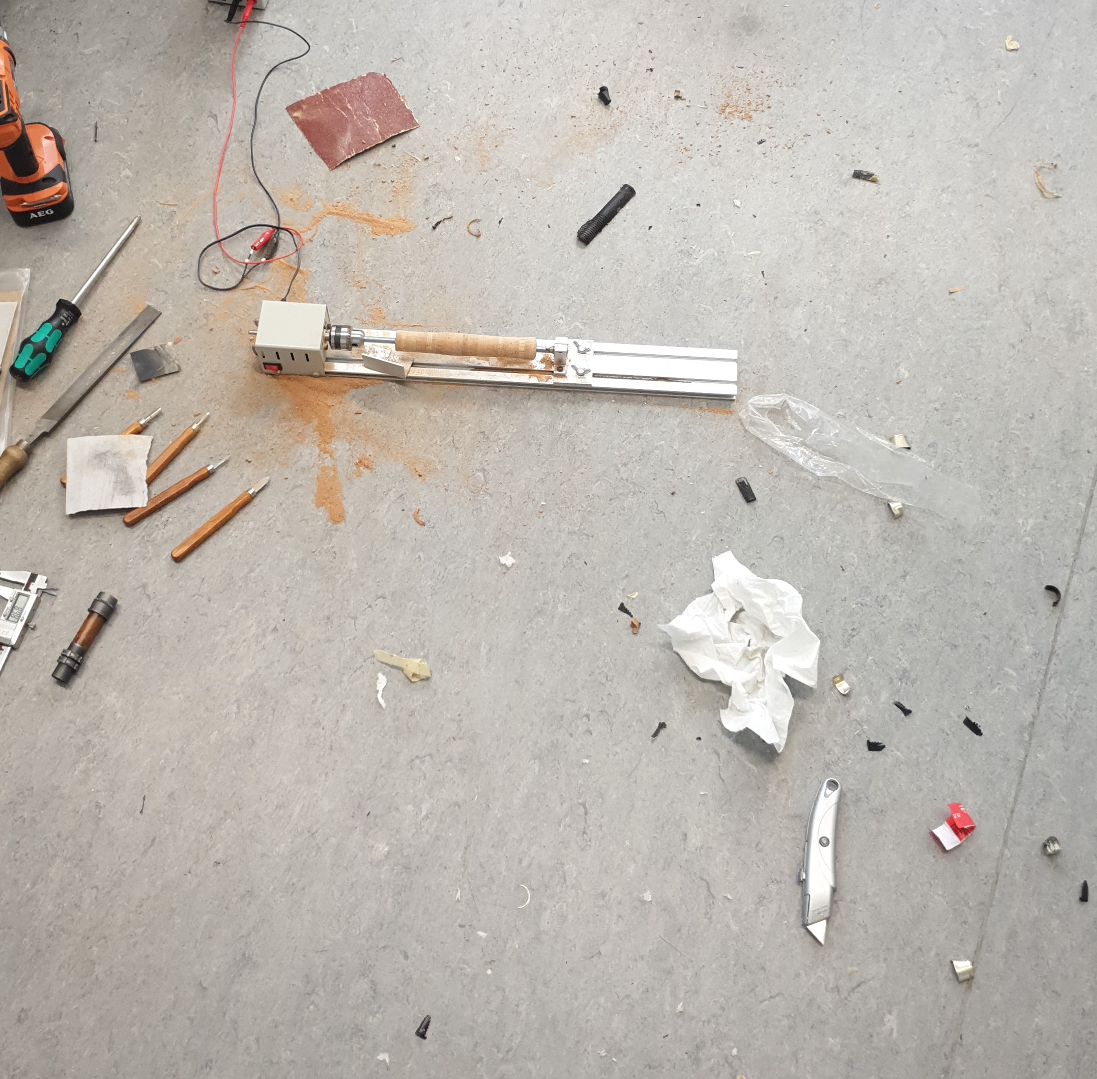 Aber ich weiß auch nicht was genau nun bei mir und der Drehbank nicht passte. Ich vermute mittlerweile, dass da sich eventuell Klebekammern gebildet haben die gegen den Beitel geschlagen sind. An einem habe ich zumindest sowas wie klebrigen Leim gefunden. Oder ich war zu schnell/falscher Winkel/oder, oder, oder. Auf jedne Fall gab es immer wieder mal in Schlag und dann war der Kork gerissen. Also wieder 5 mm weniger. Das ging so stufenweise bis ich da war, wo ich nun bin.