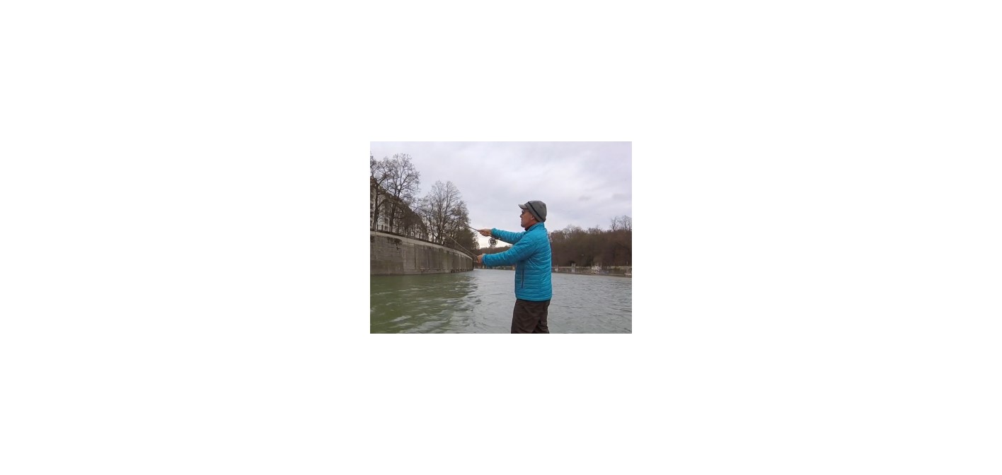 Ca. 22 Gramm auf einer langen Leine, im Wasserwurf so bei 12 Meter, in der Luft so ca. 15 Meter Hauptleine und sie landet sanft. Auch Wasserwürfe Switch Casts in völlig ausweglosen Situationen, wo praktisch auch Rollwürfe einen nicht wirklich weiter bringen, weil die reißende Strömung sofort die Leine weg pfeift. Und ich muss sagen, da zahlt sich das ganze Training wirklich aus, weil ich dann Hände wechseln kann.