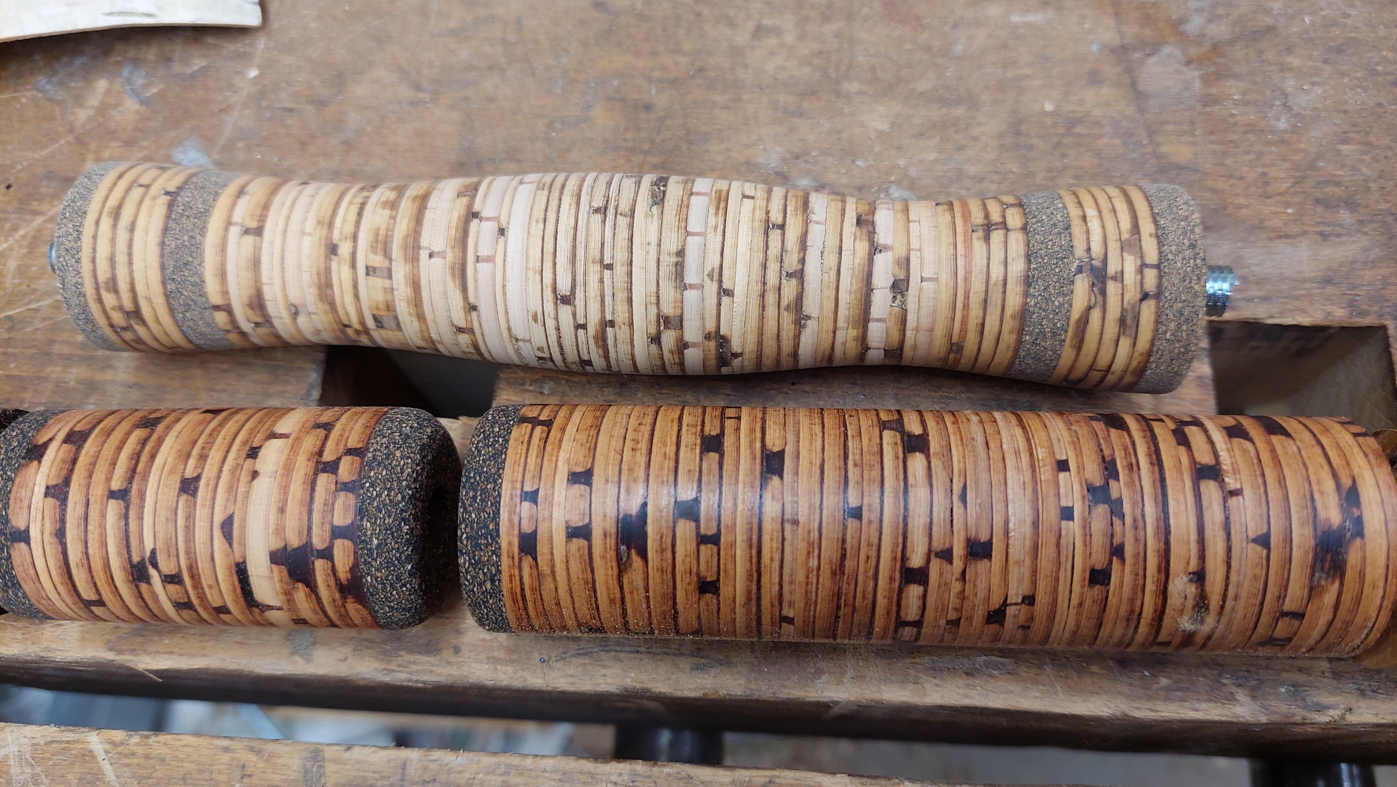 eure Beiträge haben mir echt geholfen. Plötzlich war alles klar. Sowohl der alte Kork als auch das lange Parallelstück waren mir eigentlich für die Rute zu schlecht. Also hochwertige Scheiben kleben. Aber wenn dann richtig. Also habe ich mit dem Locheisen am Freitag die Nachbarschaft generft und jetzt sind die Griffe dran. Applaus