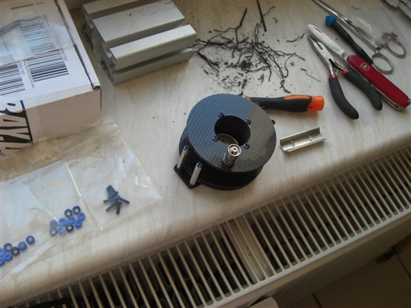 Irgendwie hab ich die letzte Zeit ziemlich viel umhergebastelt. Neue Rutenbank und Griffschleifmaschine, z.B. Im Zuge dessen, hab ich ziemlich viel "gefundene Sachen" umfunktioniert. Damit meine ich, dass ich Dinge, die eigentlich eine andere Funktion haben, benutzt und kombiniert habe. Im Zuge dessen, hab ich auch mit Alu und Titansachen gearbeitet. Und da kommen dann so Ideen. Ich wollte mir so Halter für die Führungsrollen, für die Bindebank machen lassen, da die Rollen bischen dicht beieinander sind. Da bin ich auf die Idee gekommen, dass die aus Carbon sein dürfen. Dann hab ich nach einem Frässervice gesucht und eine Announce gefunden, wo jemand vegane Fräsarbeiten anbietet. Die war recht witzig geschrieben und hat mich angesprochen. Dann hab ich diese Rubrik durchgelesen und bin den Links gefolgt und habe dann ein Video gefunden, wo Leute sowas gebaut haben, nur mit anderen Materialien. Dann hab ich das schnell aufgezeichnet und die Grafiken an den Fräser geschickt. Die Platte besteht aus einer Glasfasermittellage und Carbon Decklagen. Das lässt sich einigermaßen bearbeiten.