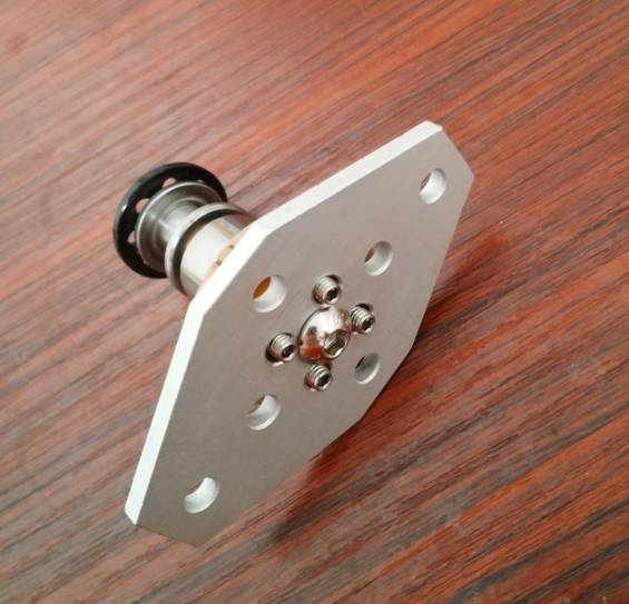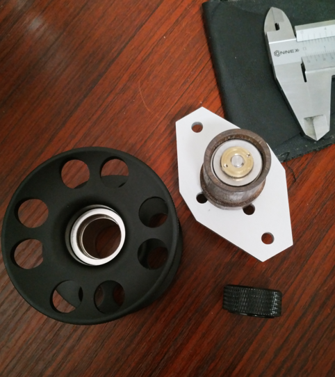 Dann sollte die Platte von hinten mit einem Drehsteller gegen einen Bremsbelag fahren und diesen gegen die Freilaufhülse drücken. Deshalb mussten da Löcher rein. Als Freilaufhülse habe ich etwas passendes für CNC Supporte verwendet. Scheint eine Bronze mit Kunststoffeinschlüssen (oder Graphit zur Schmierung
