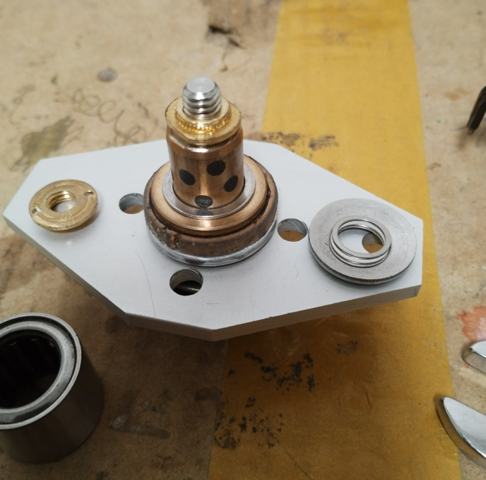 ) zu sein, die sonst auf Führungsstangen gleitet. Der Freilauf ist auch eher von dem massiven Sorte und nicht wie die üblichen Freiläufe in Fliegenrollen, mit hohem Plastikanteil und Dünnblech. Das zusammen, mit einer Korkscheibe hat schon mal zufriedenstellend gebremst Ich habe aber schon anderes Material zum Bremsen im Einkaufswagen für später. Als dann auch eine taugliche Spule da war, war klar, dass die Achse für mein Vorhaben zu lang ist und ich die komplette Bremseinheit kürzer bauen muss(quasi max. kurz). Also 10mm kürzere Achse und 3mm kürzere Freilaufhülsen besorgt. Und noch mal neu zusammengeschraubt. Da hinten ein Drehsteller verbaut wird, der gegen verlieren gesichert sein soll, wurde ein Hohlgewinde M6 in der Grundplatte verbaut, in dem sich ein M4 Gewinde befindet. Darauf ist dann auf der einen Seite eine 20mm VA Achse in 8mm verklebt (234) und auf der anderen Seite ist der Drehknopf (hier auch erst mal nur irgendein Drehknopf zum Bremse betätigen, nicht der Finale).