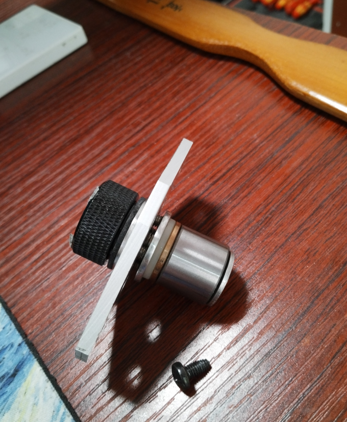 Jedenfalls bremst es jetzt gefühlt noch besser. Im Bereich von ca. 55° ist jetzt zwischen offen und ganz zu, einzustellen, also knapp über eine viertel Umdrehung. Das ist natürlich abhängig, vom Bremsensetup und ob man dort ein Paket mit mehreren Scheiben verwendet, die vielleicht noch federn, oder etwas das mehr nachgibt, wie Kork. Ich habe da aber noch gute 1,5mm Luft neben der 2mm Polyamidplatte und könnte auch mehrere 0,5er Carbongewebe oder solche rauhen Bremsbelagscheiben (anstatt Polyamid), mit 0,5 Edelstahlfederplatte (oder so) hinbauen, aber das ist unnötig und verschleißt auch mehr. Die knapp über viertel Umdrehung mit dem jetzigen Setup, geht für mich auch in Ordnung, ich brauch da nicht eine volle Umdrehung oder so. Der finale Bremsknopf bekommt dann auch einen Federpin in den Rand, so dass der Knopf rastet.