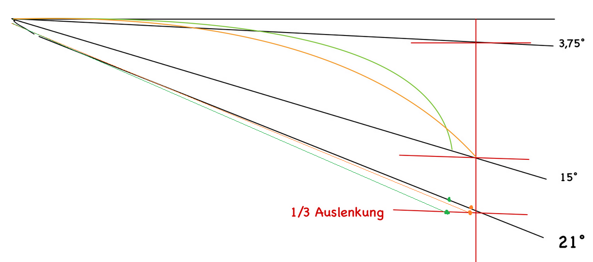 Genauere Werte würde ich dann in senkrechter Auslenkung von der Nullinie messen. Bei den Winkelmessungen an der trigonometrisch ermittelten Länge der Gegekathethe + der 1/3 Auslenkung und noch einem Wert mit noch höherer Auslenkung. Damit ich den weiteren Verlauf der Auslenkungsgewichte und damit der Kurve erfasse.
