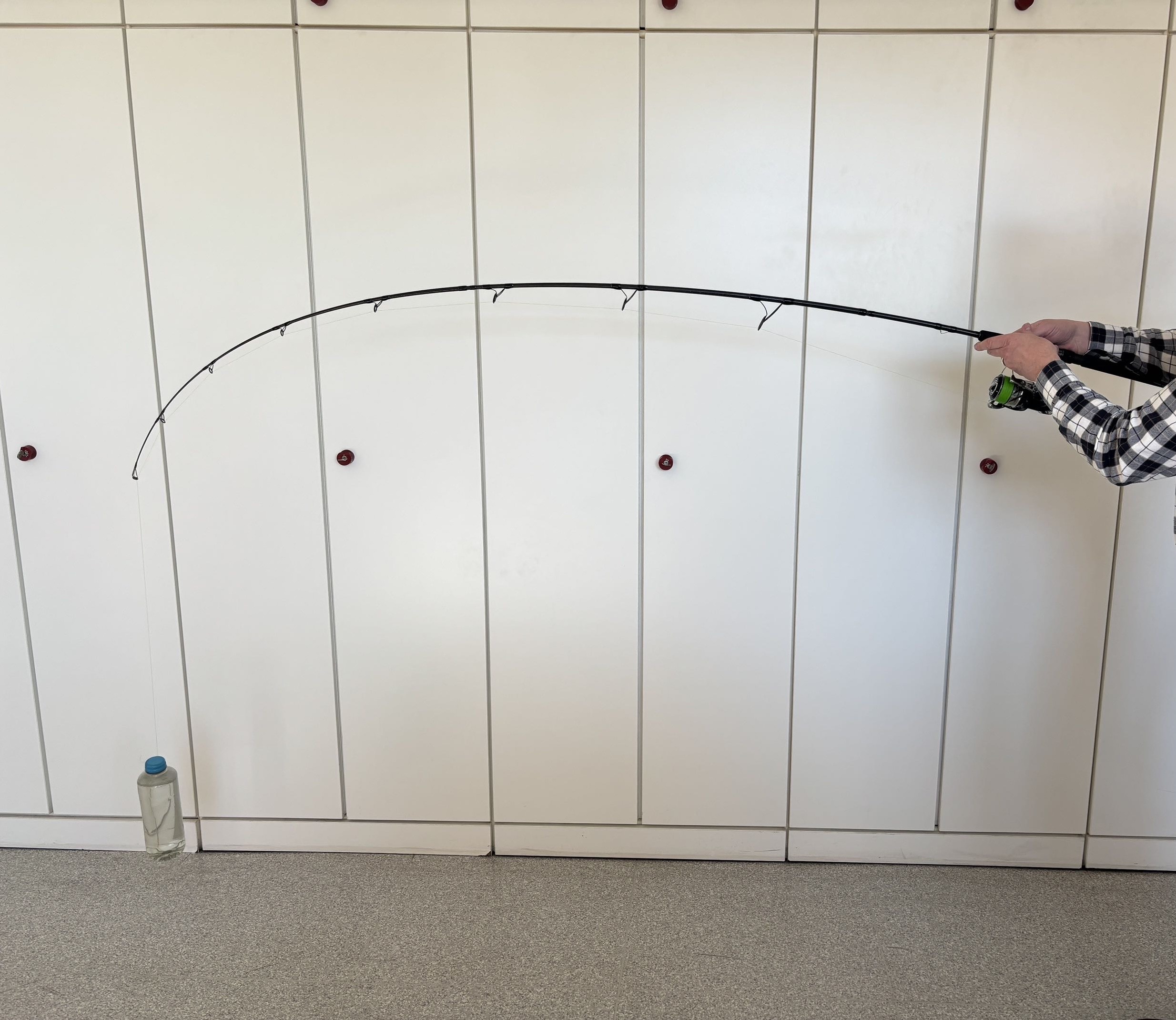 Der Blank ist mit 30lb gelabelt, ich habe mal 1kg dran gehangen (s. Foto), da ist noch Luft bis ich einen 90 Grad Winkel erreiche. Damit wird das reale Ködergewicht über 60gr liegen. Allerdings hat die Spitze etwas Flex, was gut für leichte Gewichte ist und da wird dann die Rute, je nach Art der Köder auch limitiert sein. Denke an schwere Popper, die mehr wiegen.