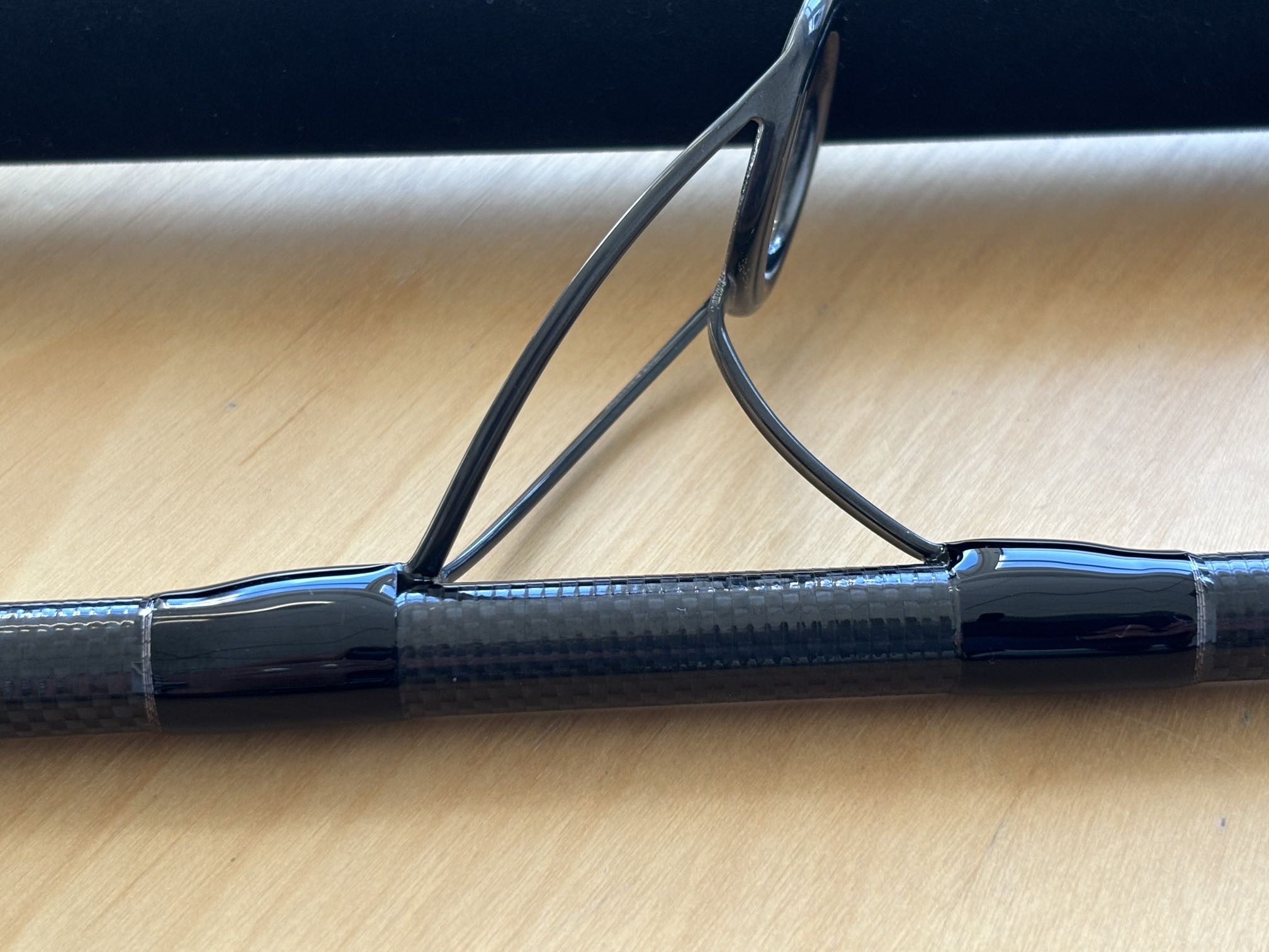 sein, rein funktionell, DPS 18, Zierringe Salzwasserfest und dazu eine Beringung mit Fuji Titan SIC T2 Ringen, Starter 30er bis runter auf 10er Zweibeiner. Mit 215gr ist die Rute schön leicht geworden. Der Blank der Rute ist schnell, schnelle Rückstellung und die Aktion der Rute mit senkrechtem Gewicht bzw. in Drillposition sehr ihr auf den Bildern. Lackiert wurde 4x, Bindung mit Pro Wrap Metallic Schwarz + Grey Metallic.