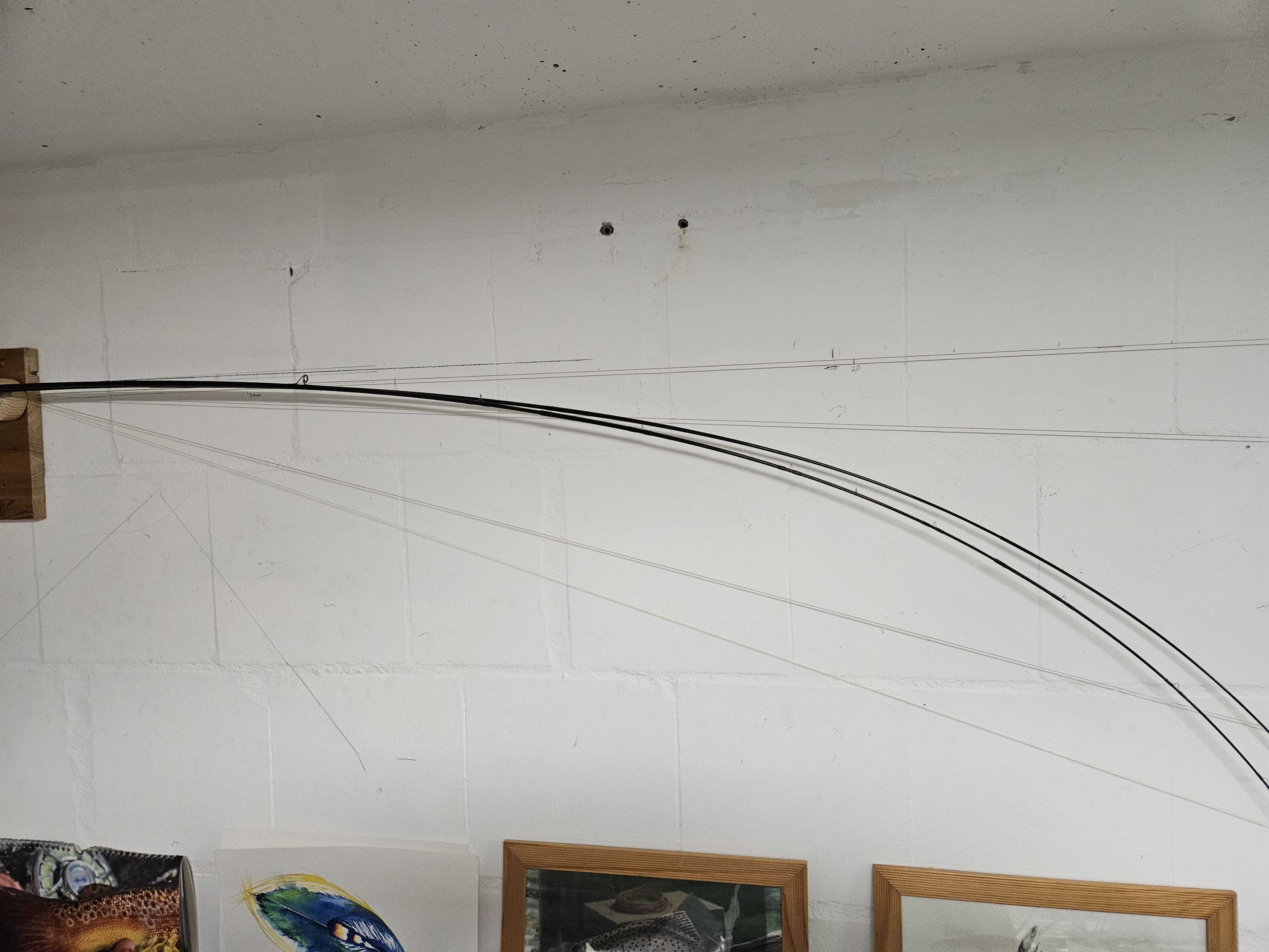 Hier mal Bilder von zwei gleichen Blanks (#2/3). Einer bereits aufgebaut, der zweite später als Ersatzteil bestellt. der neue Blank ist bei 3,75° mit 9,4g deutlich kräftiger als die Rute mit 8g und biegt sich auch anders. (Eine weitere aufgebaute Rute lag bei 7,7g) Tauscht man die obere Hälfte sieht man, dass sie unter Last fast gleich weit ausgelenkt werden. Solche Effekte übertreffen den möglichen Einfluss von Ringen, aus meiner Sicht, deutlich.
