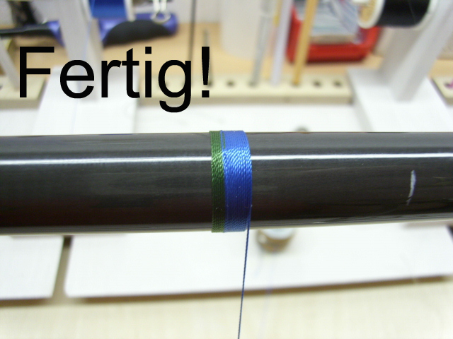 Du legst dazu ca. 15cm Trimmfaden mittig einmal gekreuzt um den Blank und wickelst beide Enden spiralförmig nach hinten. Dann dort festtapen.