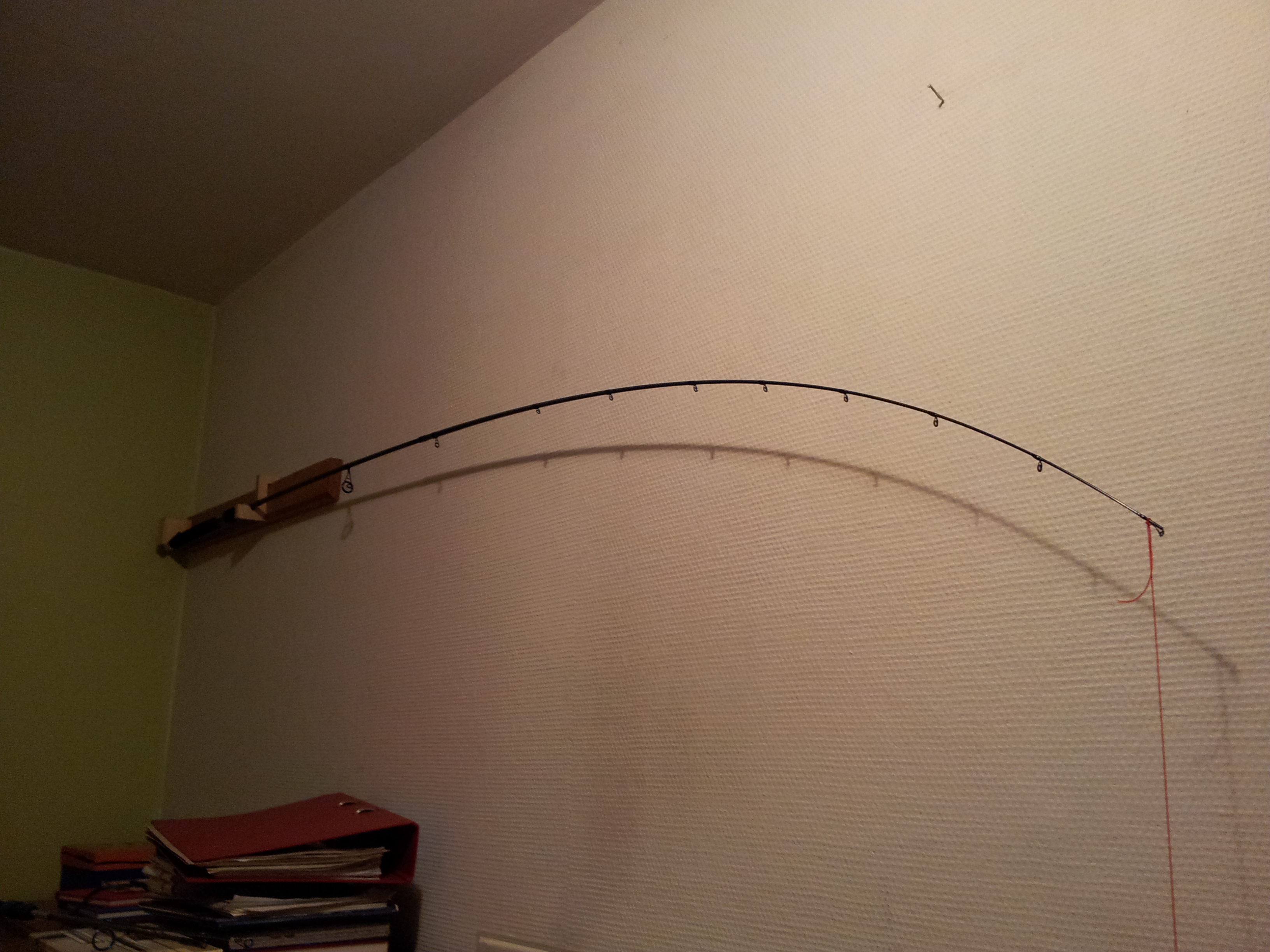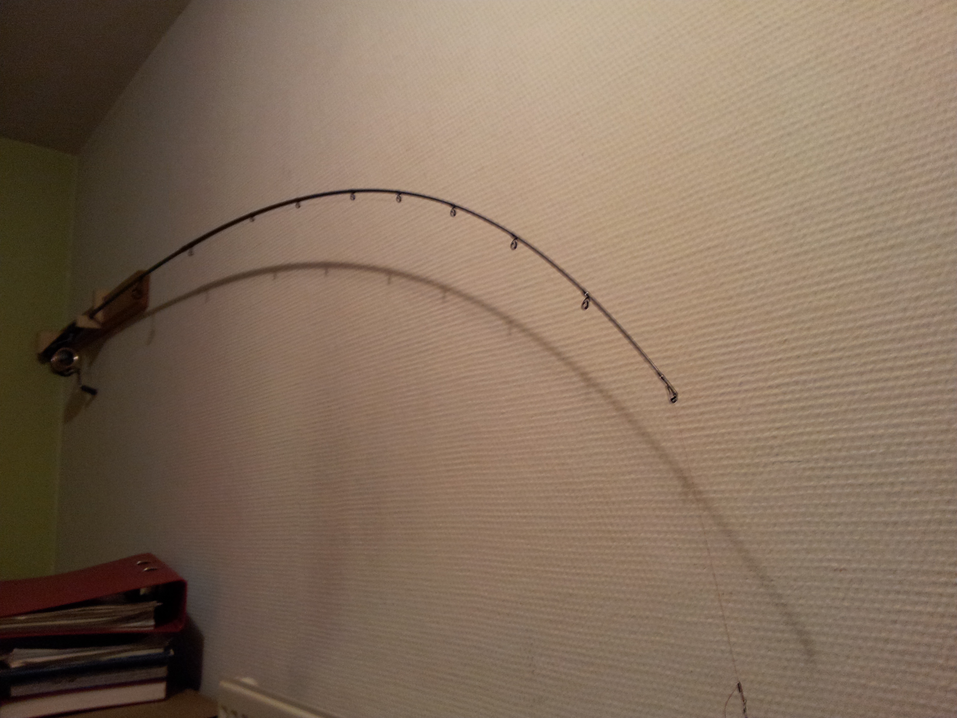 im Prinzip zeigt das Foto das belastete Rückrat der Rute, hängst du jetzt einfach mal 150-200gr. an die Spitze sollte die Auslenkung auf den ersten 20cm erfolgen.