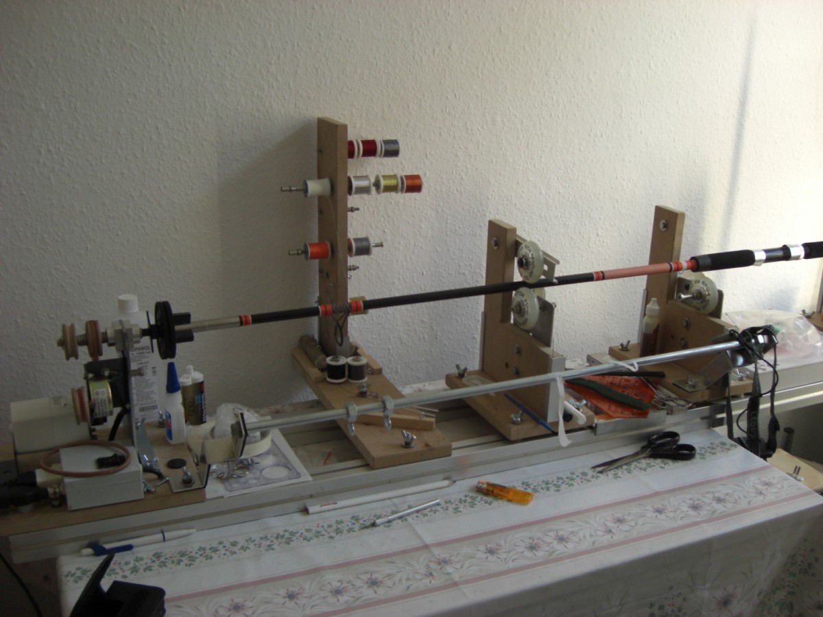 Ja die Arbeit hätt ich auch lieber auf einem vernünftigen Blank durchgeführt und vereinbart war nur Ringe anwickeln. Aber das ist ein großer Kerl ,mit großen Händen , er meint, es muß ordentlich schwer sein. Staunt aber über meine Leichtgewichte. Auf der anderen Seite konnte ich mal so richtig Wickeltechnik ausprobieren, insbesondere Tiger und das Überwickeln von weißem NCP, was mich im Vorfeld sehr interessiert hat. Na und wenns letzten Endes gefällt, dann war die Arbeit ja nicht umsonst. Ja und er arbeitet in einer Selbsthilfewerkstatt und ich fahre ein altes und geliebtes Auto, und in der Ecke steht ne Drehbank, ja ja