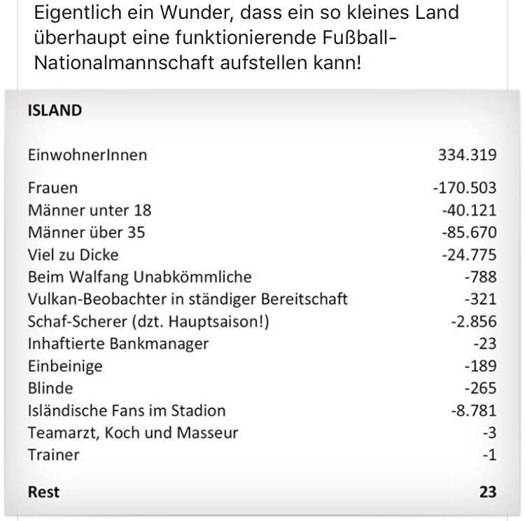 2. die Mannschaft auch eingebürgert sein ( wahrscheinlich ausgewanderte Isländer aus aller Herren Länder, vielleicht auch ein paar hellhäutige Brasilianer, die sind ja auch in anderen Ländern gern genommene " Gastspieler" ähm Einheimische