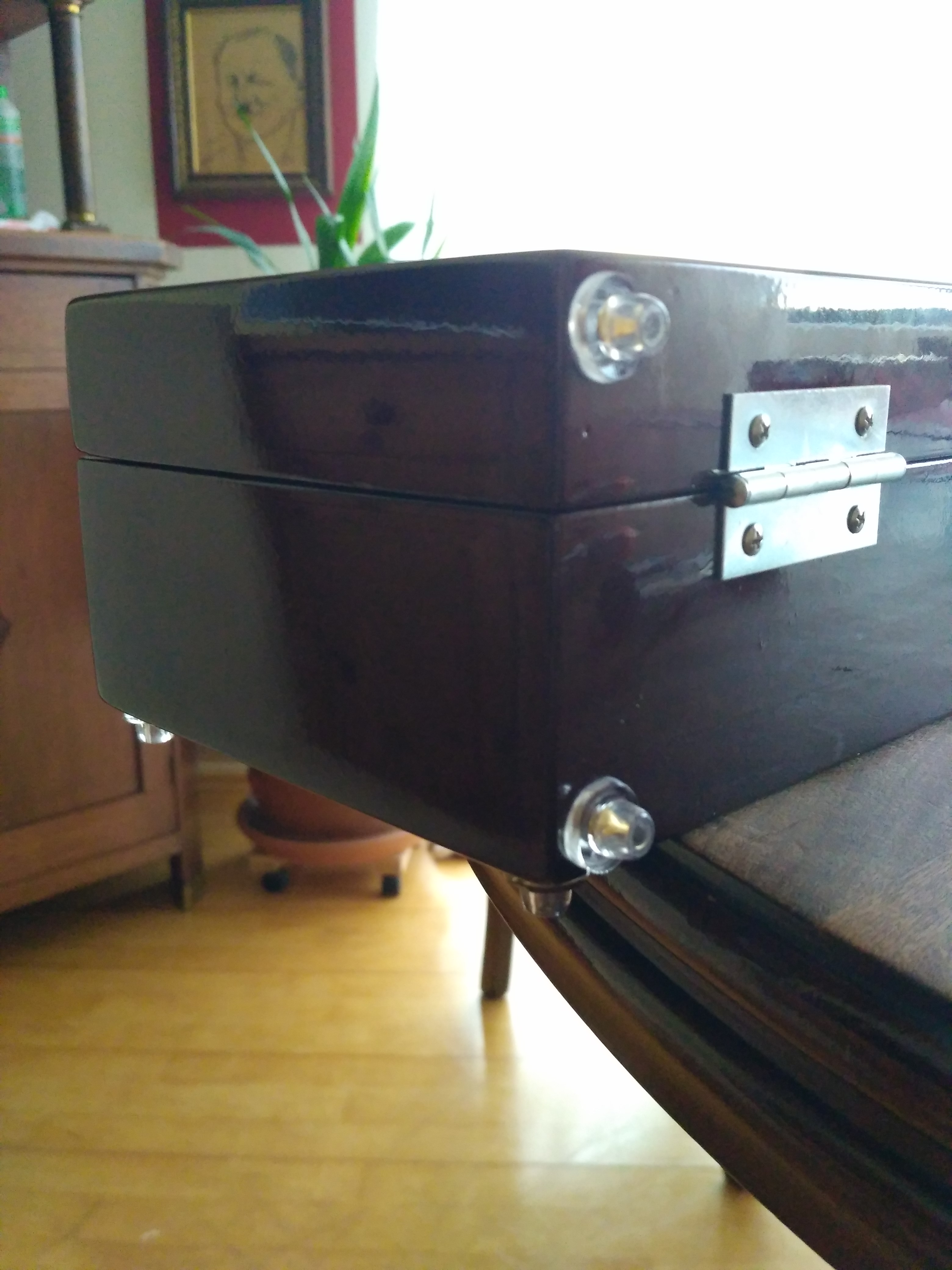 Zuerst wurden die Leisten mittels Superkleber an die Sperrholzteile geklebt, dann wurden die äußeren Leisten mit Bootsbau-Epoxi an den Korpus geklebt, dann geputzt und geschliffen, und anschließend wurde aus dem Korpus der Deckel rausgesägt. Dann innen mit längliche Sperrholzbretter die Versteifungen und Anschläge eingeleimt, alles fein verschliffen, zweimal ordentlich dick gefüllert, mit 800er Wasserschleifpapier geschliffen, dann zuerst mit Schwarz Metallic und anschließend mit Maroon Perlmetallic lackiert, und nun schlußendlich wurde der Klarlack aufgetragen. Alles Autofarben, was ich noch herumliegen hatte und habe.