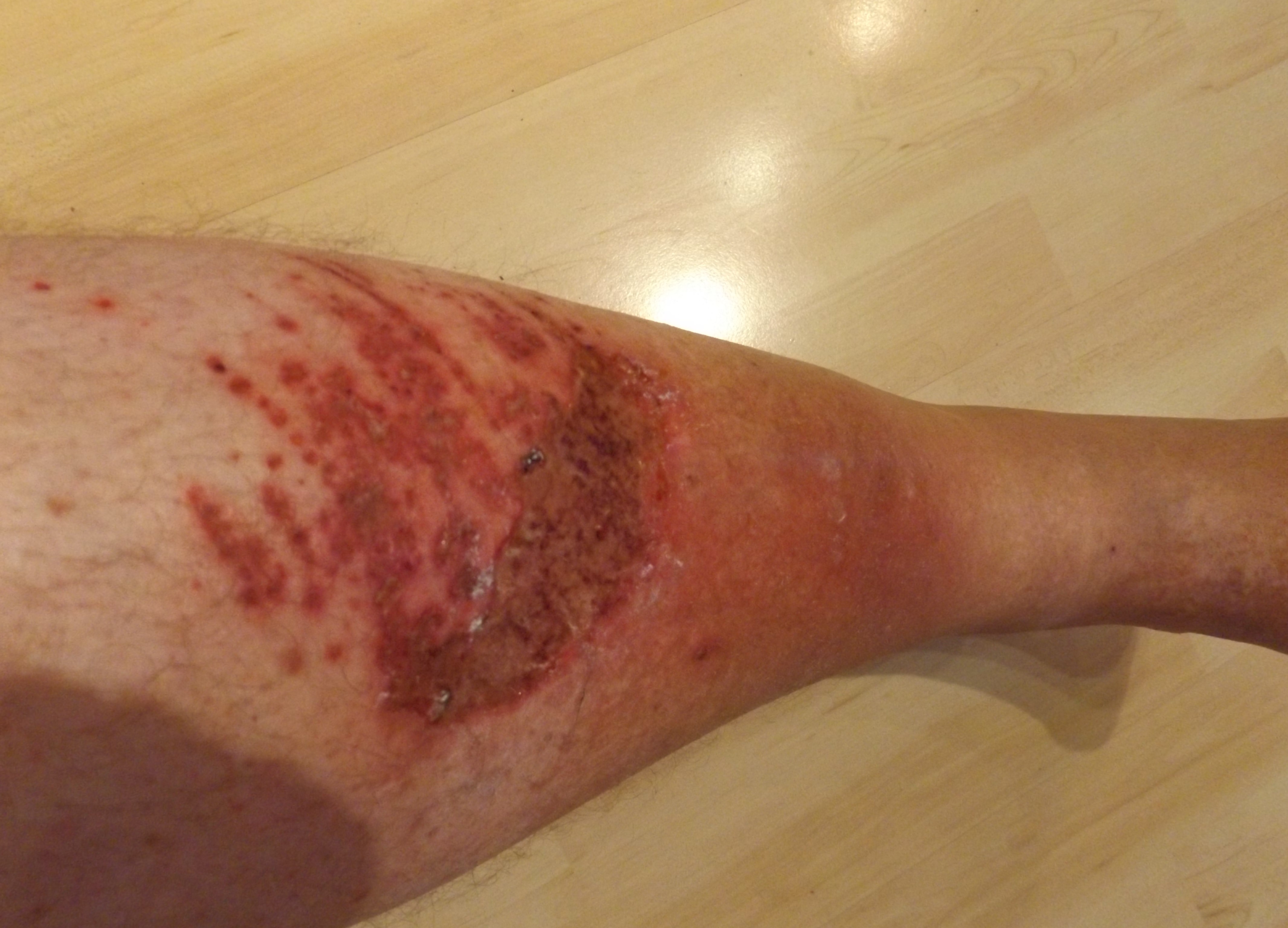 . Da ich das Bein instinktiv wegzog, zog ich mir natürlich seine Bürstenzähne der zupackenden Kiefer stramm über die Haut des Schienbeins und holte mir die "Kampfspuren", die Ihr in dem angehängten Foto sehen könnt.