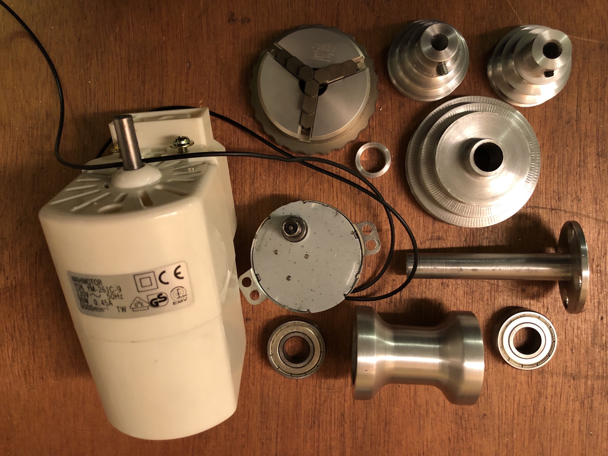 Los geht’s, die zwei Motoren-Nähmaschinen und langsamdrehenden getriebemotor zum trocknen mit 15 U/min. von früheren kauf lagen im Keller, Reststücke Alu rund-vollmaterial 40-60 mm rund ersteigert und gedreht-dreibackenfutter auch in bucht ersteigert..