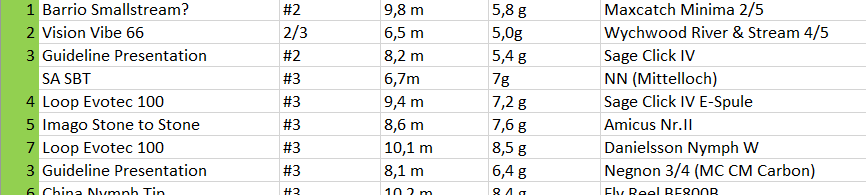 Und natürlich haben Wurfstil, Schnurtaper und Einsatzbereich großen Einfluss. Gerade bei Schnüren bin ich noch weit weg von schlau. Immer wieder habe ich da Überraschungen welche Schnur mit einer Rute harmoniert und welche nicht. Das hat aber vermutlich wenig mit ihrem Gewicht (bezogen auf die Keulenlänge) zu tun. Bessere Werfer als ich können sicher auch den Wurfstil so adaptieren, dass sie mit mehr Tapern und Schnurgewichten klarkommen. Mir geht es aber nicht darum wie und was man alles mit einer Rute machen kann. Wenn ein TLT Werfer mit einer #3 Schnur wirft, macht es eine #5 Rute ja nicht zur #3.