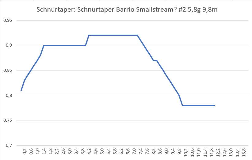 ich habe die Schnur gerade noch mal grob nachgemessen. Die ersten 30ft wiegen ziemlich genau 5,3g. Das Taper ist ein wenig anders als heute, aber ich meine der Hersteller wurde auch mal gewechselt. Es könnte also wirklich eine einfarbige etwas ältere Smallstream sein, und wenn nicht hat man ja trotzdem eine #2 Schnur. Ich habe auch meine Messungen zum Taper der Schnur gefunden. (Siehe Bild)