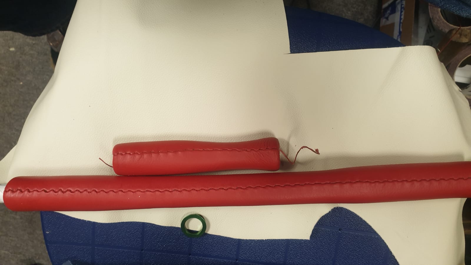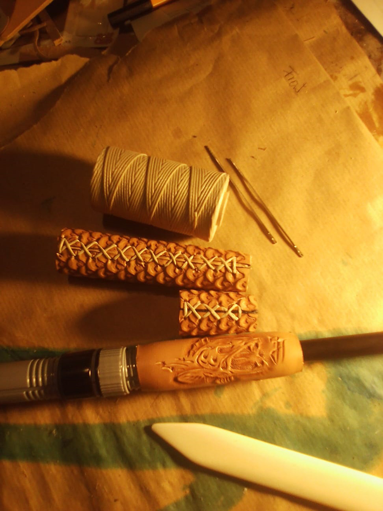 06 Bezug Geschnitten.jpg 07 Leder und Garn.jpg 08 Naht offen.jpg 09 Griff fertig1.jpg 10 Griff fertig2.jpg