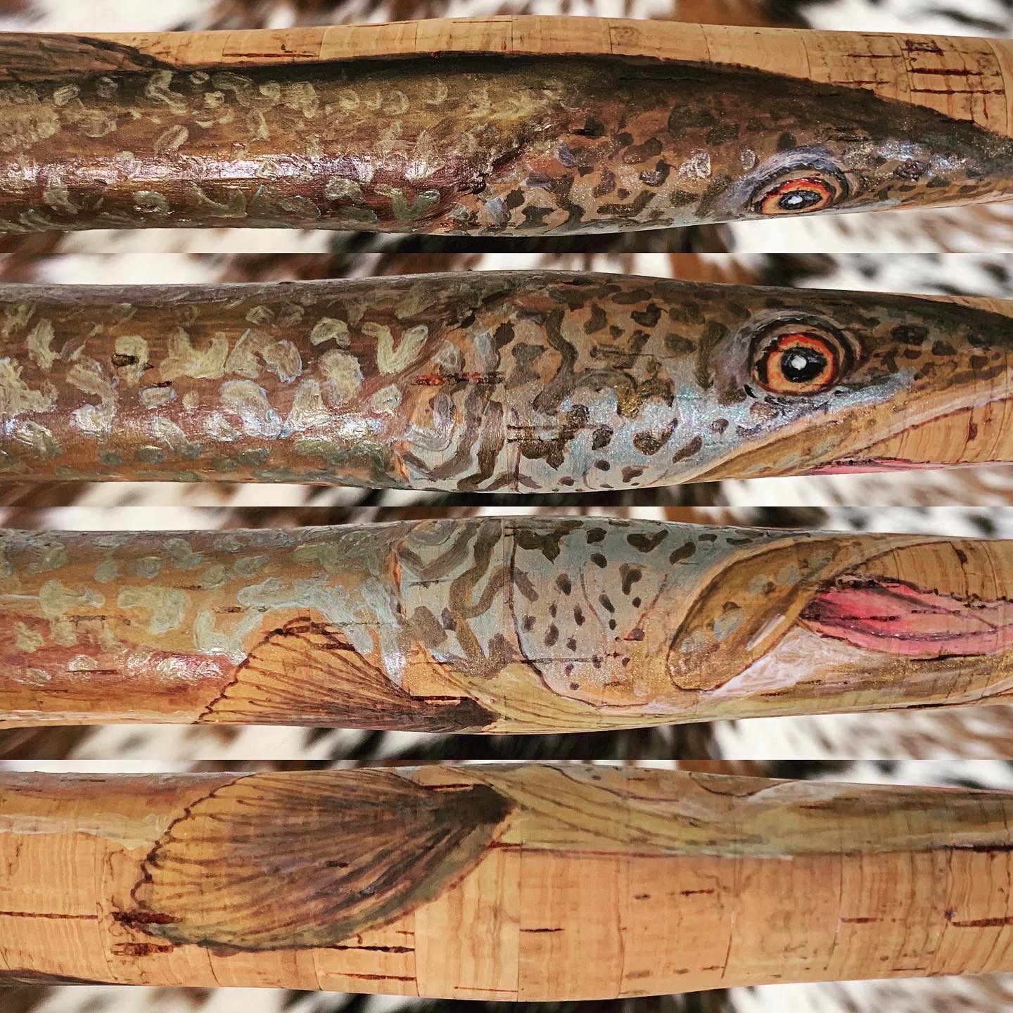 der Griff wird zuerst skizziert, dann mit einem feinen Lötkolben gebrannt und dann mit Acrylfarben bemalt. Ganz am Ende dann mit Corkseal versiegelt.