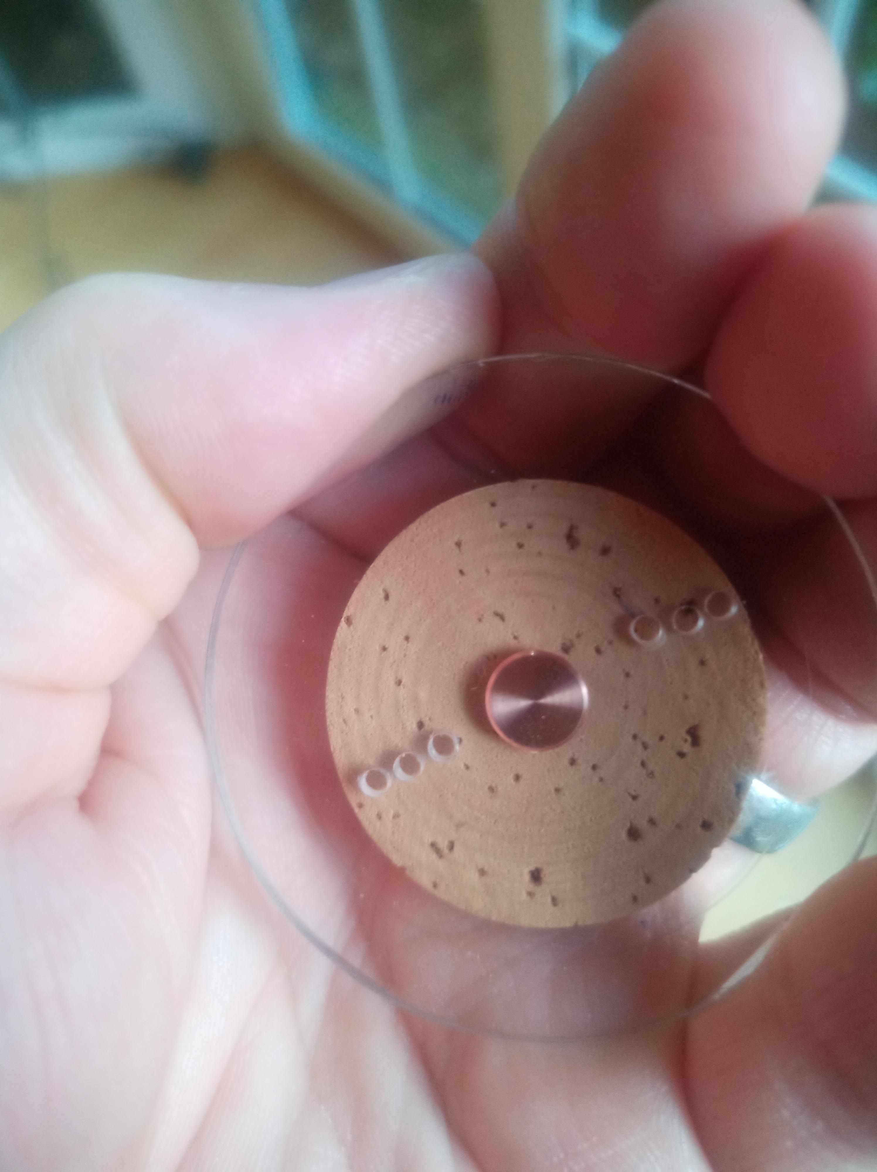 Durch die kleinen Bohrungen kann man mit einem Bleistift oder ähnlich sehr schön einen Kreis auf den Kork übertragen.