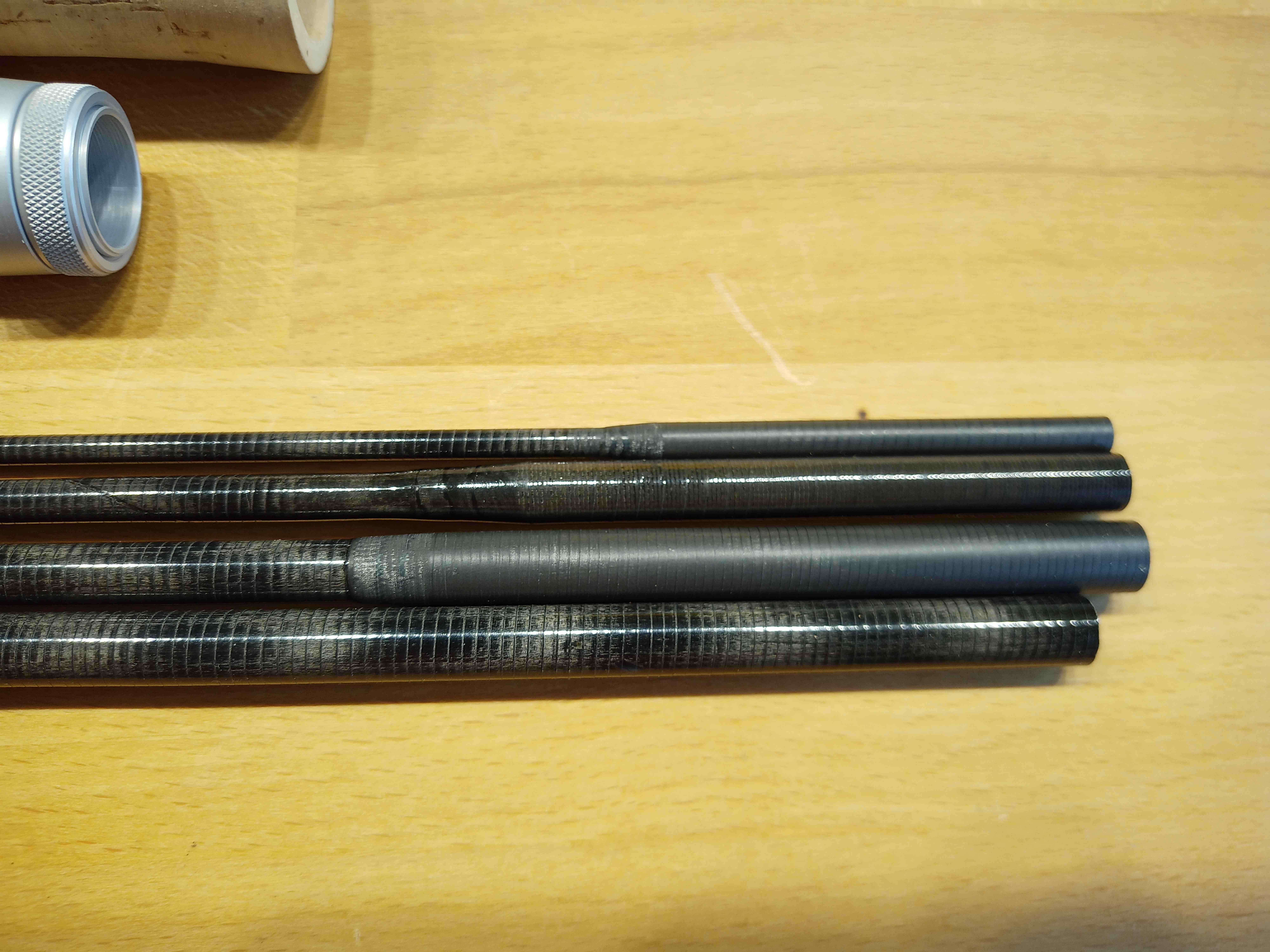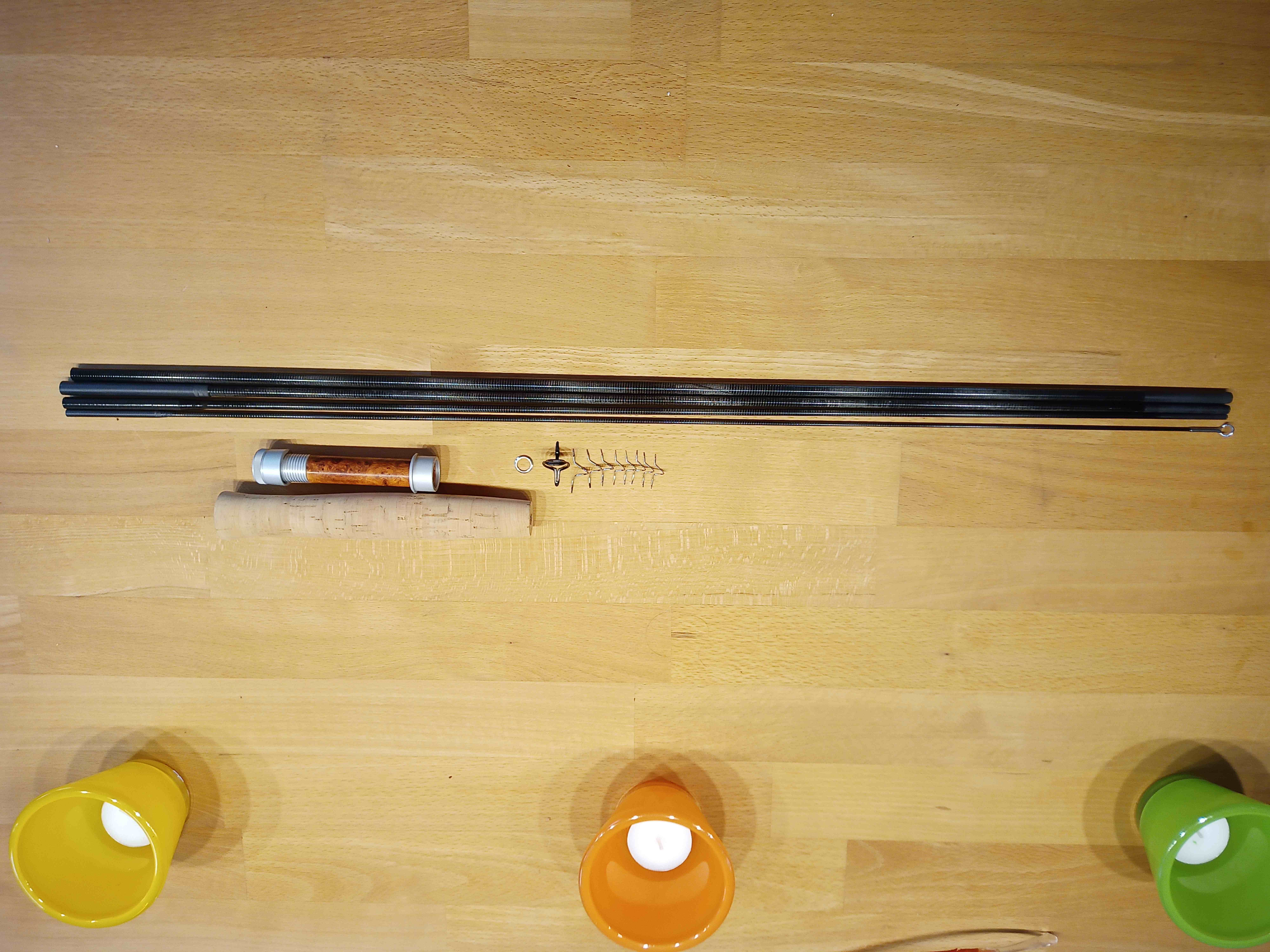 Einen ungeschliffenen Fliegenrutenblank (vermessene #6), der optisch ziemlich gut zu den ungeschliffenen aber lackierten Orvis Blanks passt, hatte ich noch rumliegen. Ich habe den Blank mal für wenig Geld in China bestellt. Einer meiner Reinfälle, da er fürchterliche Weak Spots vor den Überschubverbindungen hat. Nun wird er sinnvoll verwertet und reicht bestimmt für noch einen der Orvis Blanks.