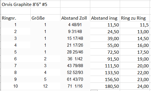 Als Beringung hatte ich mir eigentlich 9+1 vorgestellt, da die Biegekurve doch sehr durchgehend ist und ich den 10ten Ring für unnötig halte. Durch die Teilung wäre dann aber mindestens ein Ring auf einer Hülse gelandet. Das wollte ich nicht. Also sind es, nach ein klein wenig hin- und herschieben 10+1 geworden. Da ich beim vorletzten Projekt eine Tabelle für die Ringabstände erstellt habe, wurden diese jetzt auch archiviert.