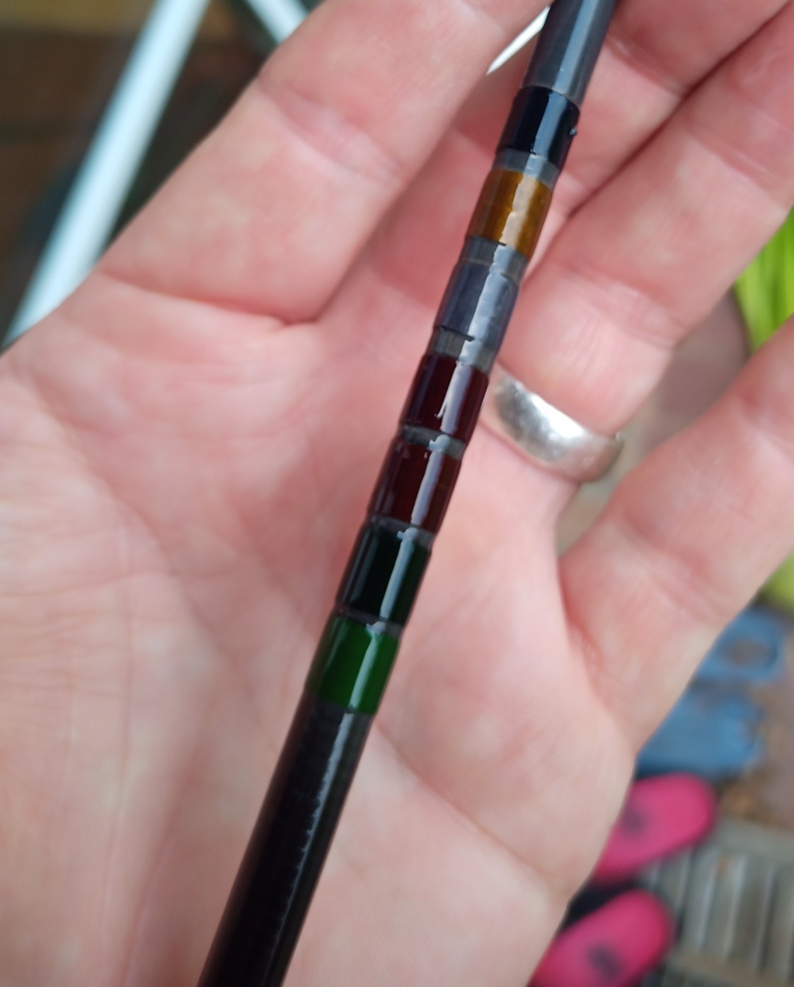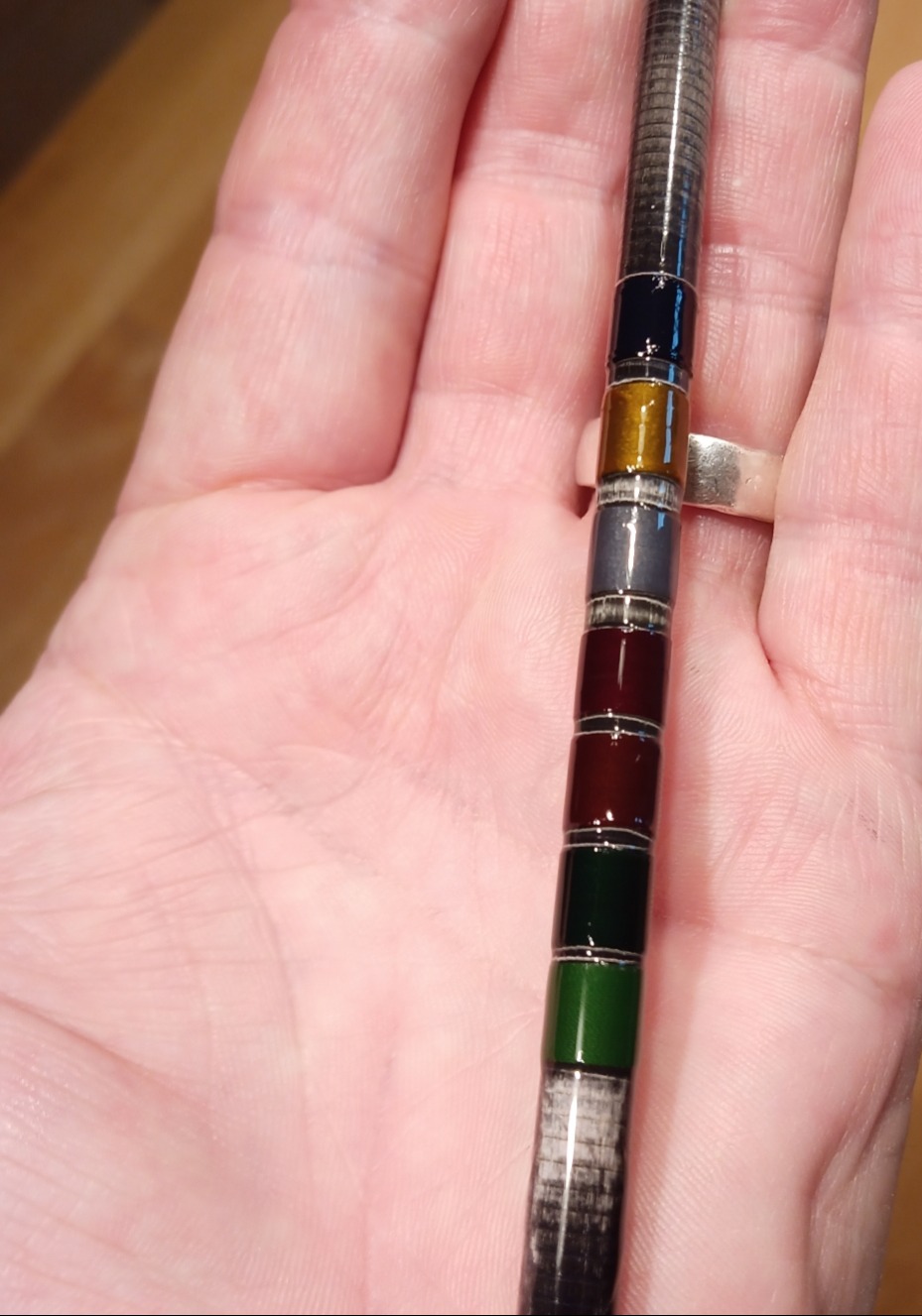 Einen Fototermin hatte sie aber schon. Aus der Hand heraus betrachtet ist das Grau der Wicklungen fast unsichtbar. Die Farbwahl war also passend, auch wenn ein Tupfer Farbe der Rute ebenfalls gut gestanden hätte. Bei der Hülse vom Spitzenteil hätte ich die Wicklung am konischen Ende kürzer machen sollen und nicht ebenso lang wie die anderen Wicklungen auf den drei Hülsen.