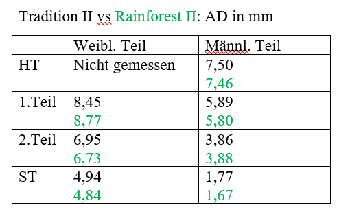 Die Messwerte des AD geben da keine Auskunft, ich habe deshalb mal versucht den ID zu messen. Das ist mir aber zu ungenau, um die Werte hier anzugeben, gerade beim männlichen Teil beim Übergang zum ST war mir da kein genaues Messen möglich. Allerdings scheint die Wandstärke der Rainforest (mit dem höher modulierten Carbon) um etwa 0,1mm (also 100 µm) größer zu sein. Das passt durchaus zu dem, was eine Lackschicht aufträgt. Fürs Augenmaß stelle ich mal ein Bild ein. Links ist immer die RF, rechts davon die TR. Da die Ränder nicht plan geschliffen sind ist es aber schwer zu sehen.