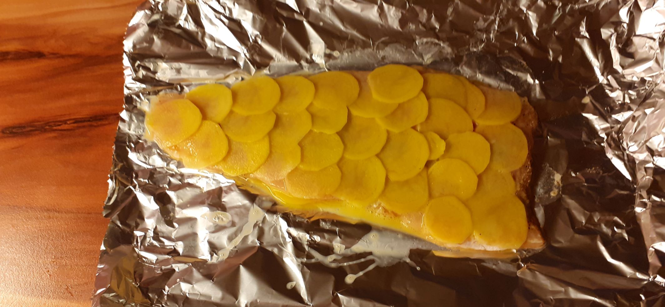 Die Alufolie bleibt darauf da wir sie benötigen um den Fisch in die Pfanne zu legen