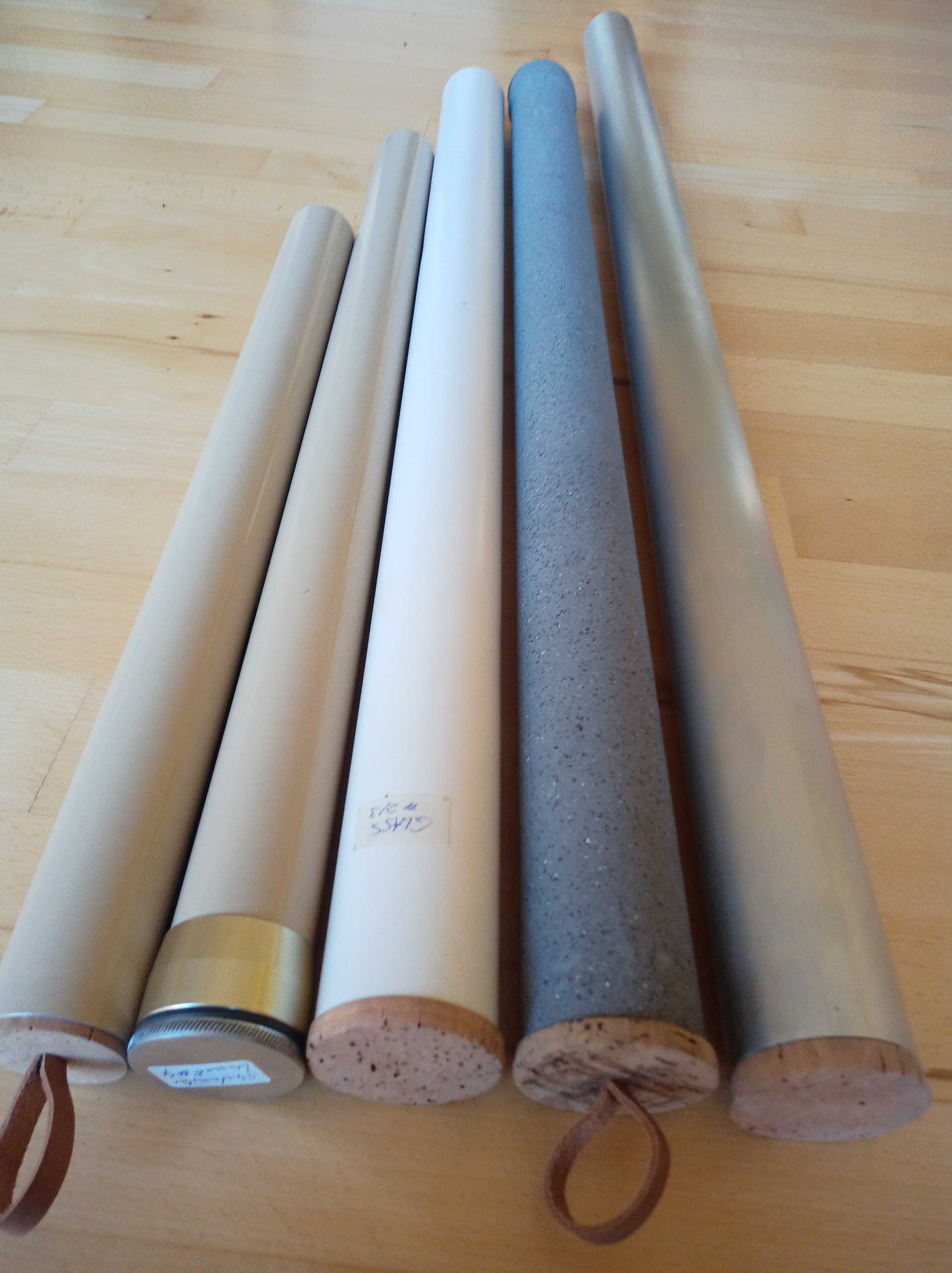 Neben Alurohren habe ich bisher meist die Kunststoffrohre genommen, in denen die Blanks von Aliexpress geliefert werden. Ist zwar übel die Aufkleber abzubekommen, dafür aber feinstes Upcycling.