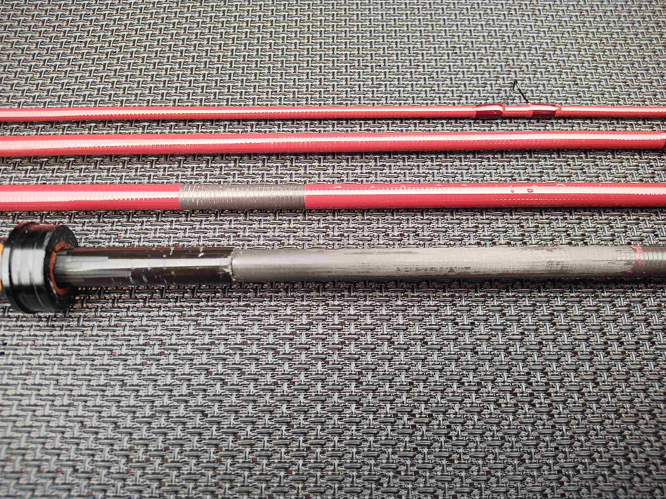 Und ich stehe jetzt auf dem Schlauch, wie gehe ich weiter vor. Vollständig entlacken fällt flach, da ich die ungeschliffene Optik wohl nicht erhalten kann. Da behalte lieber die Farbe. Nur die anderen Ringe runternehmen geht evtl. auch schief, da sich die ungeschliffene Blankstruktur wohl nicht überall erhalten lässt. Wäre zudem eine unfreundliche Arbeit und ein sauberer Übergang zum Blanklack echt aufwändig. Gäbe allerdings eine interessante Optik, mit der man spielen könnte. Im Moment neige ich dazu, die restliche Beringung zu lassen, die Wicklungen an den Blankenden alle abzunehmen und durch Schwarz zu ersetzten. Ebenso die Wicklung am Griffteil und die des Leitringes. Den gleichen Rotton werde ich nicht hinbekommen, da das Garn auf dem Blanklack gewickelt ist. Dann lieber einen Kontrast der zum Rollenhalter und den Ringen passt.