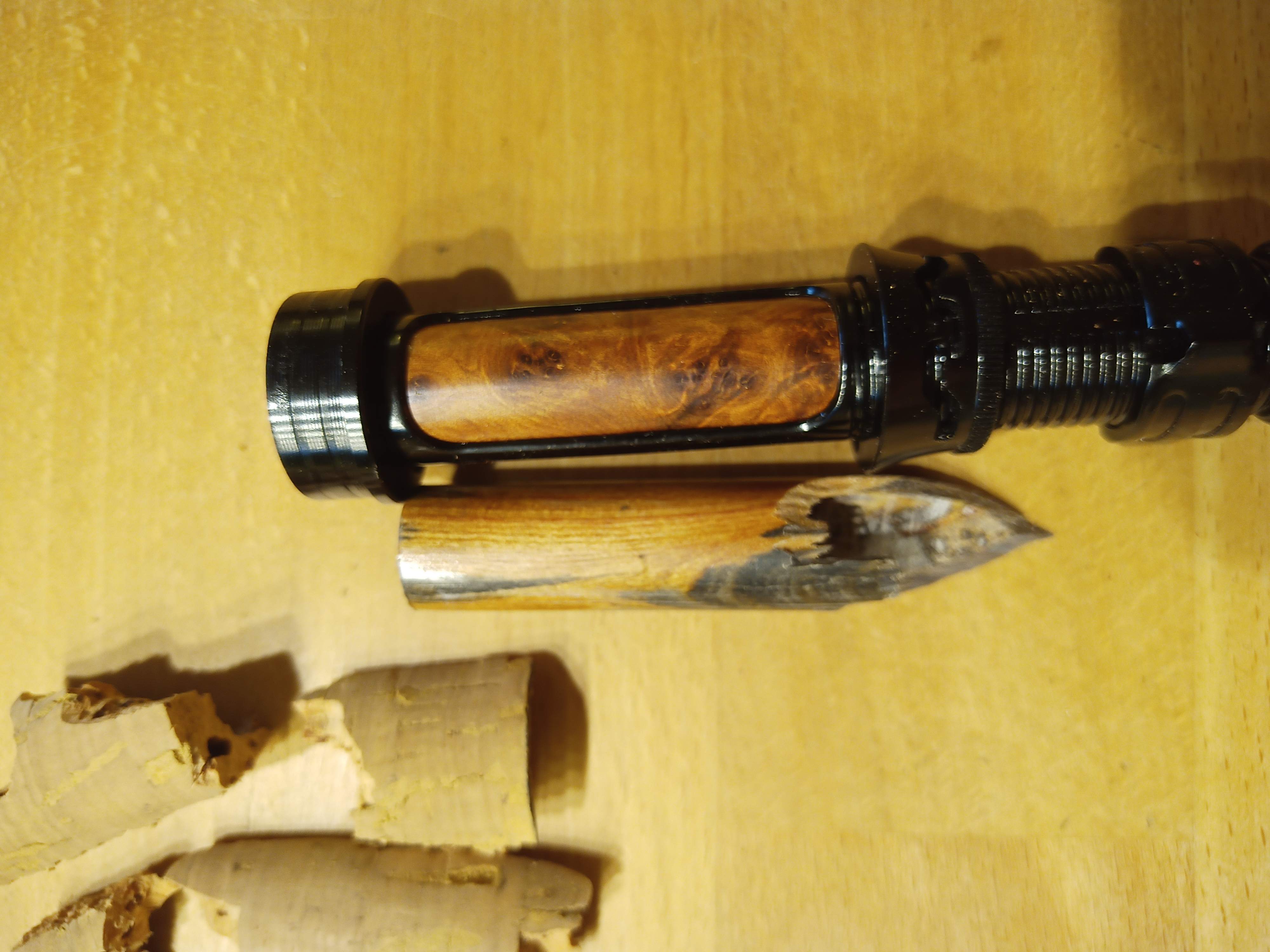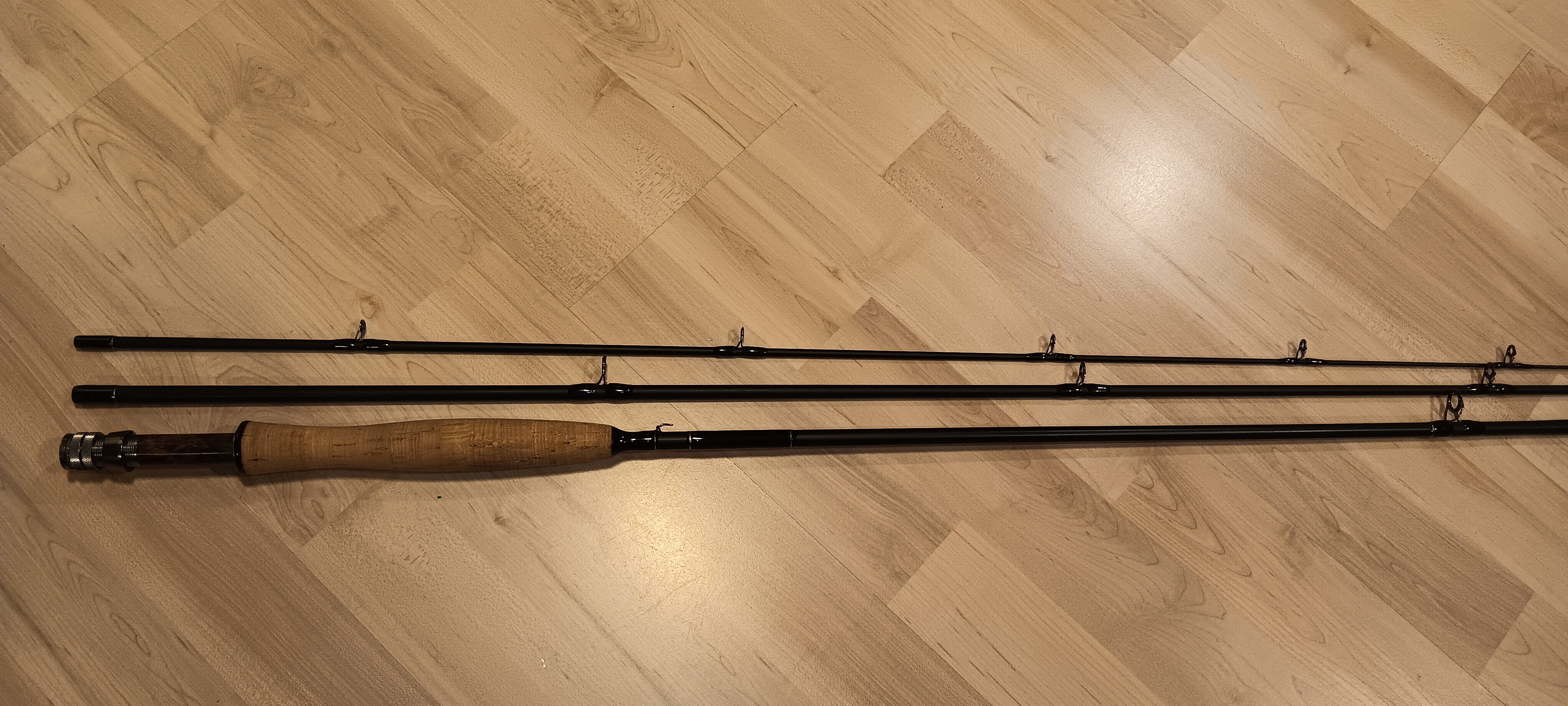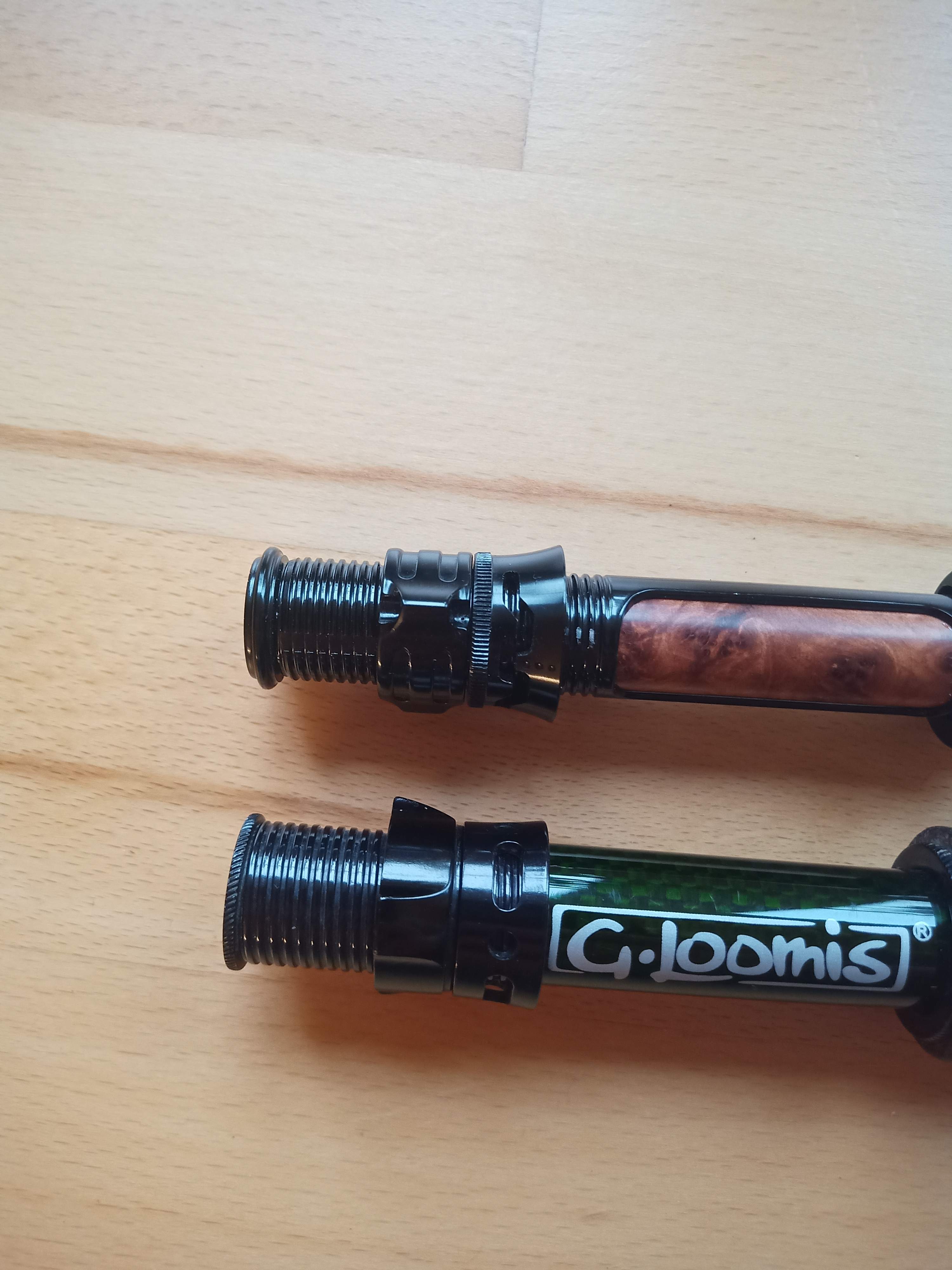 Den Rollenhalter finde ich extrem schick. Die Löcher in der Überwurfmutter (als Fliegenhalter?) halte ich aber für Blödsinn, da wäre bestimmt die Eloxierung ruckzuck ab. Den Spacer fand ich allerdings hässlich. Alle Versuche den Rollenhalter abzumachen sind aber gescheitert, er saß bombenfest. Also habe ich ihn abgesägt, ausgebohrt und durch einen aus Thuja ersetzt. Mit der Säge bin ich inzwischen sehr entspannt, besonders weil das Endstück bei einer Fliegenrute keinen Anteil an der Performance hat. Verlängert habe ich den Blank, indem ich ein Blankstück übergeschoben habe. Hat fast genau den Durchmesser des Rollenhalters und spart mir die Unterfütterung. War aber Zufall, lag gerade rum.
