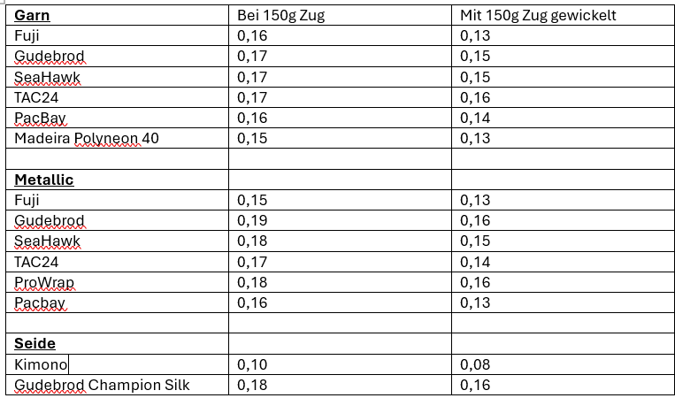 Metallicgarn ist aber deutlich formstabiler als die geflochtenen Schnüre die ich kenne. Und verzwirnte Garne solten das ebenfalls sein, wenn man z.b 150g dranhängt und Wenn man keine validen Werte bekommt, dann kann man ja das Garn aufwickeln, packen und dann den Auftrag des Garns durch zwei teilen. Das könnte recht valide Werte bringen