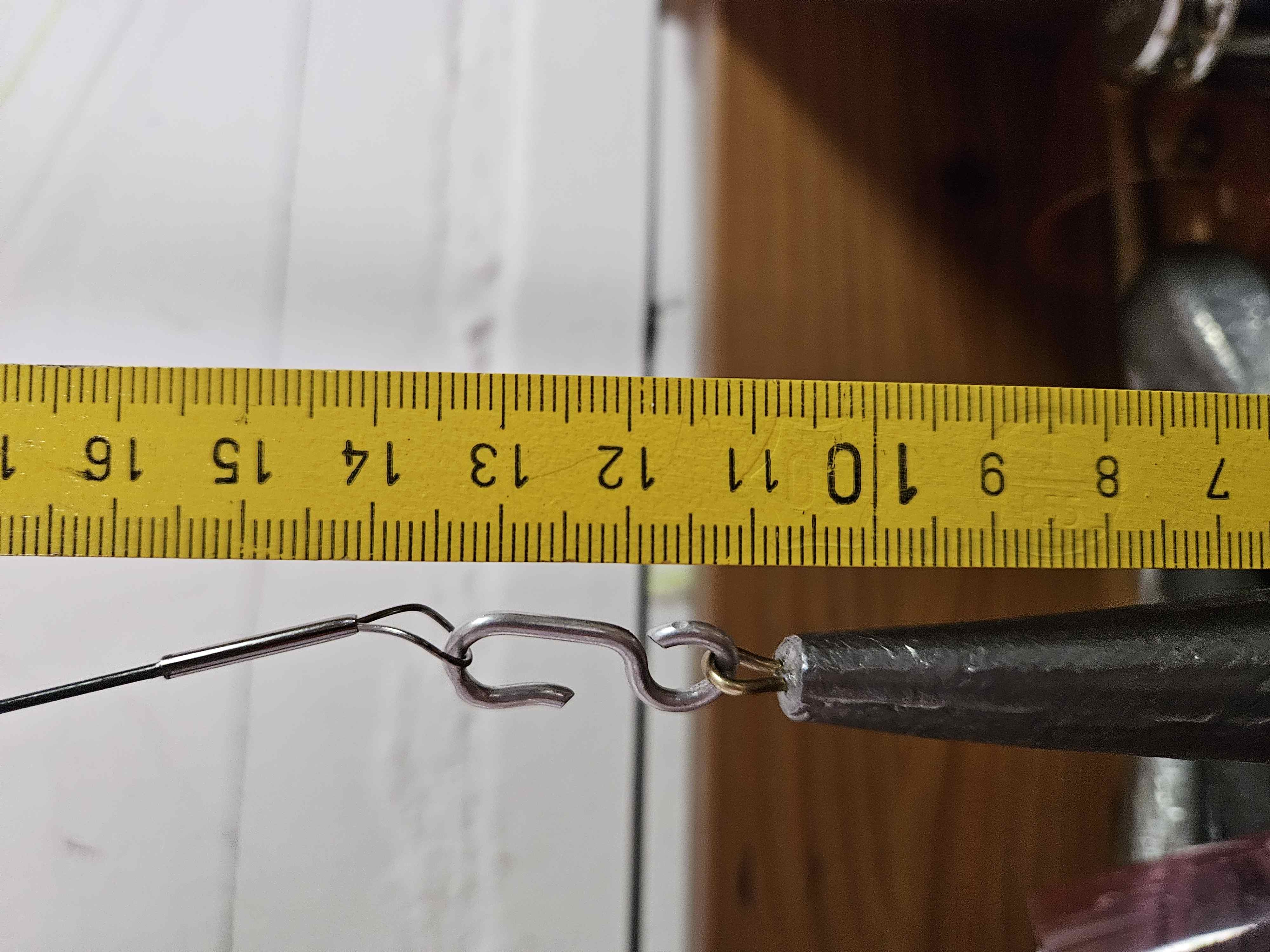 Die ERN ganz genau zu messen nervt mich ja! Die Spitze fängt sofort an zu wackeln, wenn man mit dem Zollstock gegen das Gewicht kommt. Man muss aber dicht ran um genau zu peilen. Diesmal habe ich eine Ködernadel genommen um möglichst genau zu sein. Sonst schere ich mich nicht um einen halben Zentimeter. Die CCS Methode misst ja auch in 2,5g Schritten, was auch nicht genauer ist. Der AA ist auch nicht besser. Ich mache immer ein Foto und lade das in einen Onlinewinkelmesser. Was für ein nerviger Aufwand.