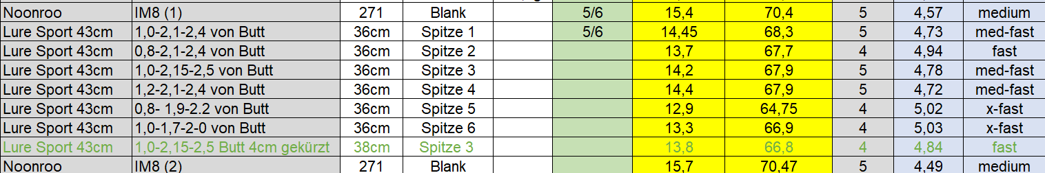 Die Werte der Ruten werden sich am Ende noch ganz leicht verändern, da ich die Ruten nebeneinander vermessen habe. Das ist ein klein wenig ungenau.