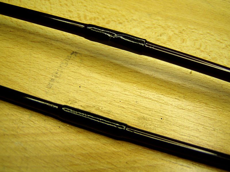 Ich habe eine Stelle mal aufgeschnitten, darin fand sich tatsächlich ein eingeklebtes 5cm Stück Kohlefaserstab, das sogar beinahe zum Blankdurchmesser passte.