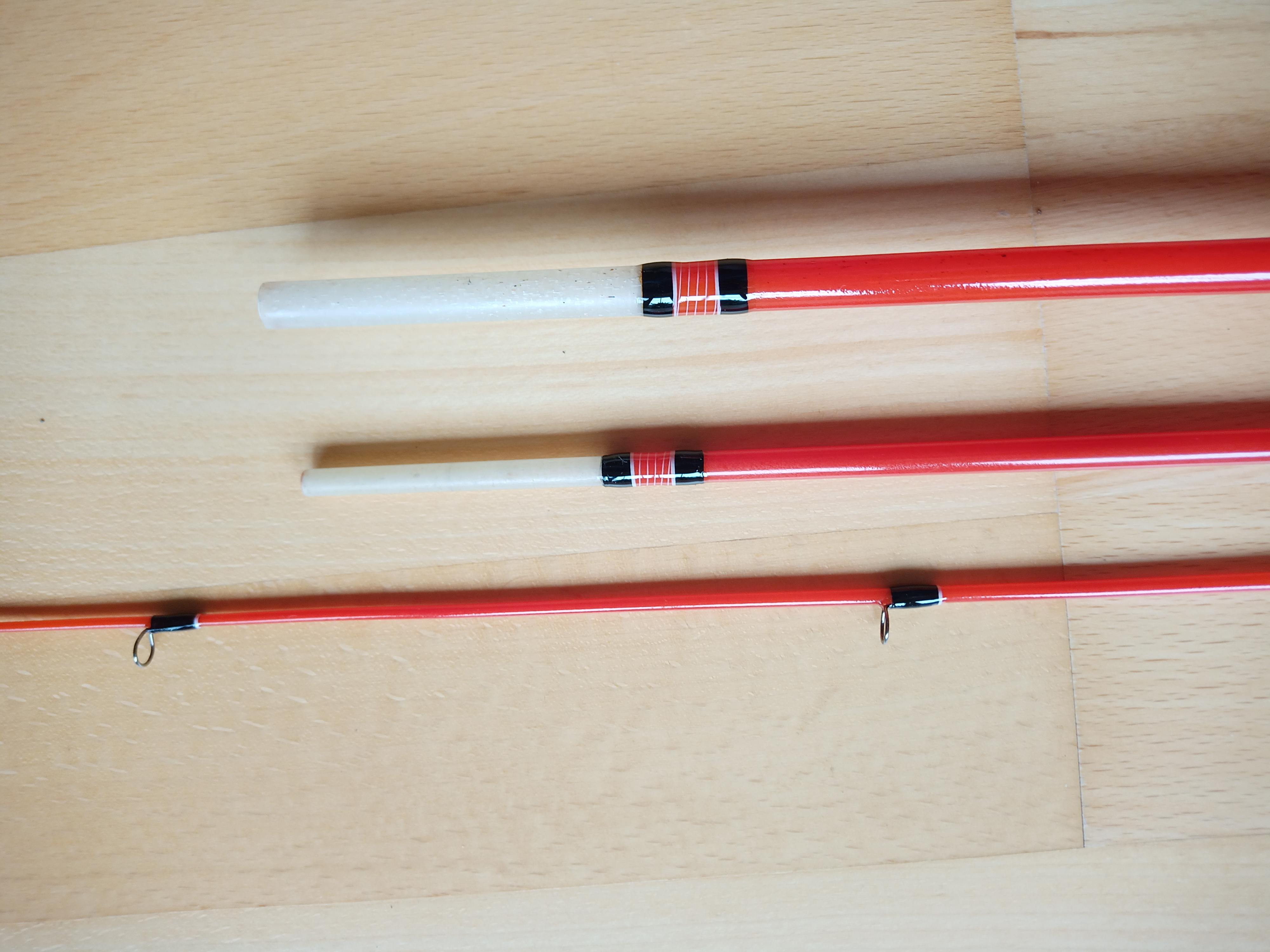 Da die Einschubverbindungen durch eine zusätzliche Mattenlage verstärkt waren, habe ich mich mal an das „Blanktuning durch mittiges Kürzen“ gemacht welches Reinhard mal vorgestellt hat und von Hand-und Mittelteil jeweils 14cm abgesägt und mit sehr wenig schleifen eingepasst. Zudem habe ich den Lack abgeschabt, der farblich nicht so meins war. Leider war der Blank zwar weiß, aber mit vielen dunklen Einschlüssen, dass er mir so auch nicht gefiel. Ich habe dann eine Dose Transparentlack von Auto-K in Orange gekauft, mit dem man z.B. ausgeblichenen Blinkern frische Farbe verpassen kann. Allerdings ist die Lackierung nicht ganz perfekt geworden und hat mir mal wieder bestätigt, was ich sowieso schon wusste. Lackieren ist toll, aber nicht meine Stärke, musste den Lack polieren bis der Arzt kam. Den Einschubbereich habe ich ausgelassen, da er schon perfekt eingeschliffen war und ich die Kratzfestigkeit des Lackes nicht einschätzen konnte. Außerdem glaube ich, dass so der Farbunterschied beim Überschub so weniger deutlich wird, wenn die Rute zusammengesteckt ist. Sieht bei transparenten Blanks manchmal nicht so schick aus.