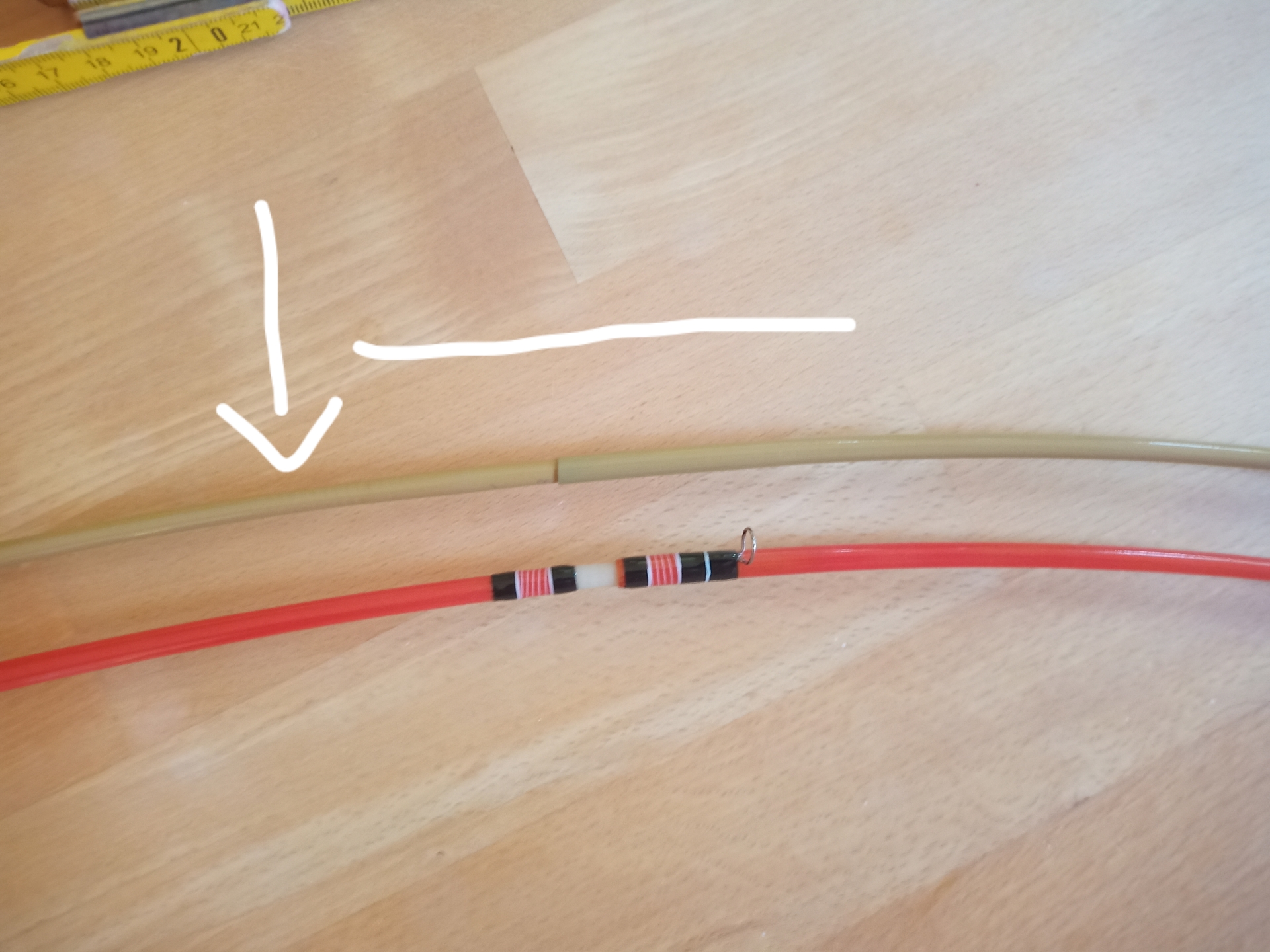 Kommt auf den Bildern vielleicht nicht so deutlich rüber, aber ich würde die Versteifungen schon als Flatspot bezeichnen. Fällt schon ziemlich auf, wenn man den Blank biegt. Die "Zapfen" sind 10cm lang, der Blank wurde hier kräftig aufgedoppelt und ist hier ziemlich versteift. Durch das Tuning fallen die freiliegenden 5cm weg und der neue "Zapfen" ist auch deutlich biegsamer. Der Zapfen geht jetzt auch nur noch 4cm in die Hülse. Da die Hülse auch recht lang ausfällt, habe ich sie ebenfalls um gut einen Zentimeter gekürzt. Insgesamt fallen also ca. 7cm der Versteifung bei der Überschubverbindung weg. Wenn man das letzte Bild genau anschaut kann man es schon erkennen, gerade wenn an von der Seite drüberpeilt (so der Bildschirm den Blickwinkel hergibt).