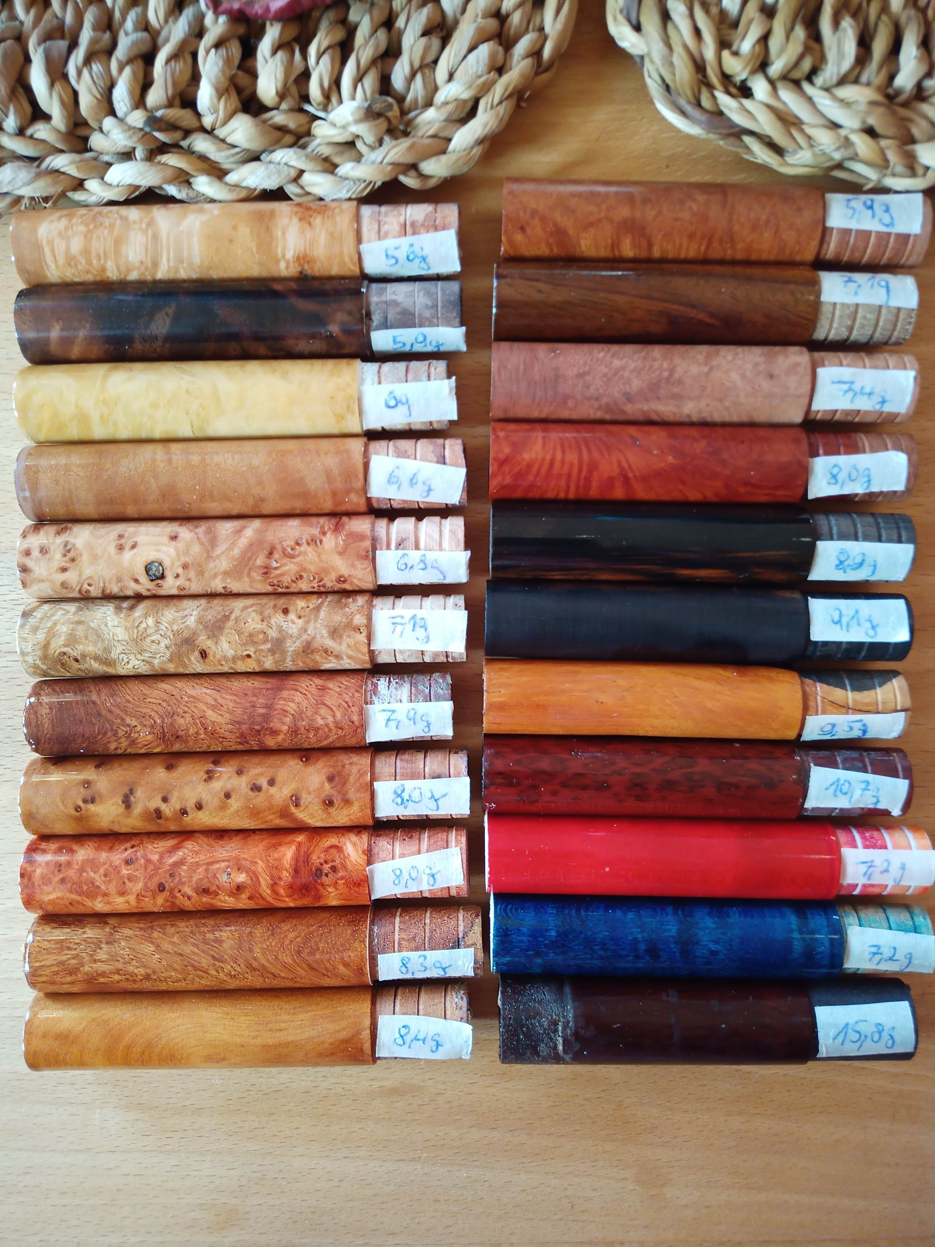 Meine sind stabilisiert, haben einen AD von 17,3mm wegen Kernloch PG11 und 10mm Bohrung. Je nach Holzart wiegen die dann ca. 1,5- 2g/cm.