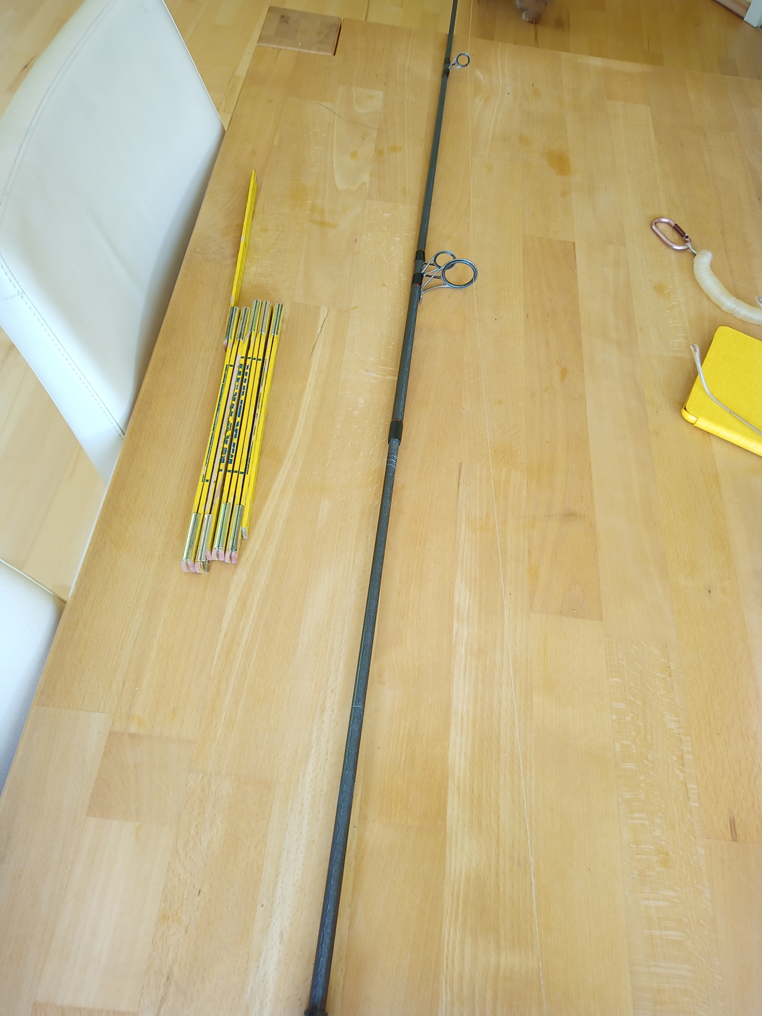 Sollte sich die Rute für den Einsatzzweck gut machen, dann werde ich ihr noch mal eine bessere Ringaufteilung spendieren. Gute Bilder gibt es nichts, ich habe die Rute pragmatisch und nicht schön umgebaut. Dafür hat es, ohne die Kopfarbeit, auch kaum mehr als zwei Stunden reine Arbeitszeit gekostet.