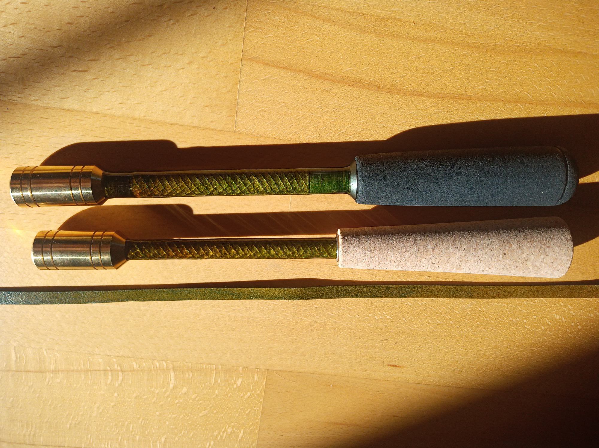 Da ich es hasse nach so einer Arbeit einfach nur ein Anschauungsobjekt zu haben, habe ich ein altes Handteil und ein Blankstück passend ausgewählt, um Prieste zu bauen. Das Lederband ist auch mit Deka Transparent gefärbt, ich habe es dann aber weggelassen. Und die Wicklungen bei dem einen Priest sind in weiß und ebenfalls mit Deka Transparent gefärbt.