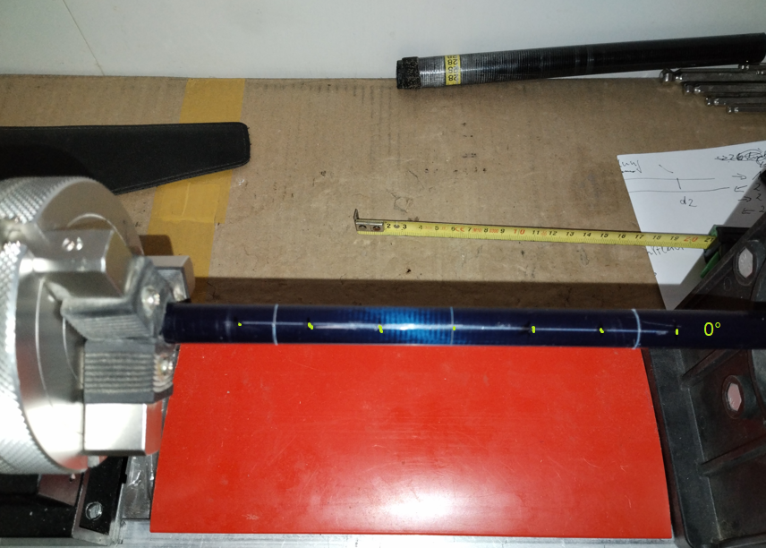 Wie gehe ich vor.? Ich überlege mir, wo ich die Wicklung auf dem Blank fertigen möchte und wie lang diese wird. Dann markiere ich die Wicklungslänge. Es ist zu beachten, dass man vor und hinter der später sichtbaren Wicklung, eine ausreichend großen Bereich benötigt, wo man die Fadenenden umlegen und während des Wickelns temporär befestigen kann. In der Regel zeichne ich eine Achse in der Draufsicht in Längstrichtung ein. Das ist meine 0° Achse. Dann zeichne ich gegenüber auf der Unterseite eine Achse in Längstrichtung ein, meine 180° Achse. Die Achsen zeichne ich noch ein Stück über die sichtbare Wicklungslänge, Anfang und Ender der späteren Wicklung wird dann später eh überwickelt. Für das gerade Anzeichnen ist sicher ein Alignmenttool empfehlenswert.