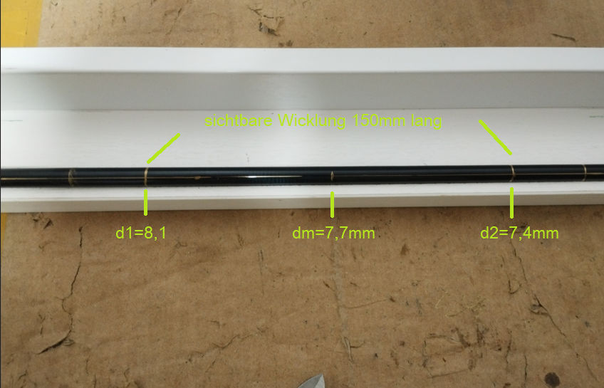 ja Frank, ich habe mir gedacht für eine Demonstration der Machbarkeit, nehme ich einfach mal, was so ein wenig über ist. Das ist nur ein Blankstück gewesen und keine Rute, weshalb es da um nichts ging. Vielleicht versuche ich das demnächst noch zu lackieren, weil ich so eine längere Wicklung noch mit Gießharz testen wollte.